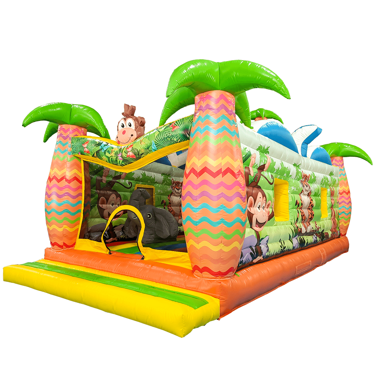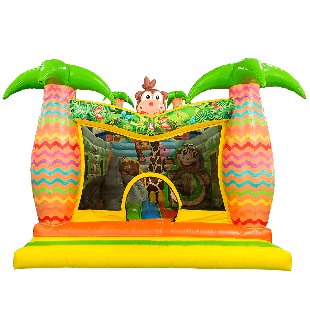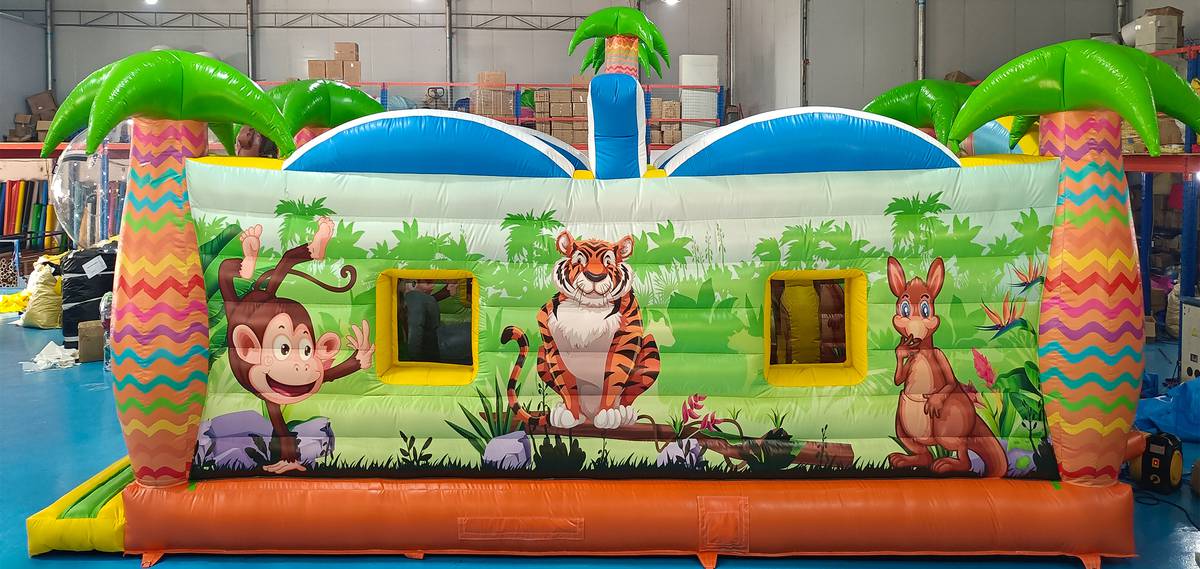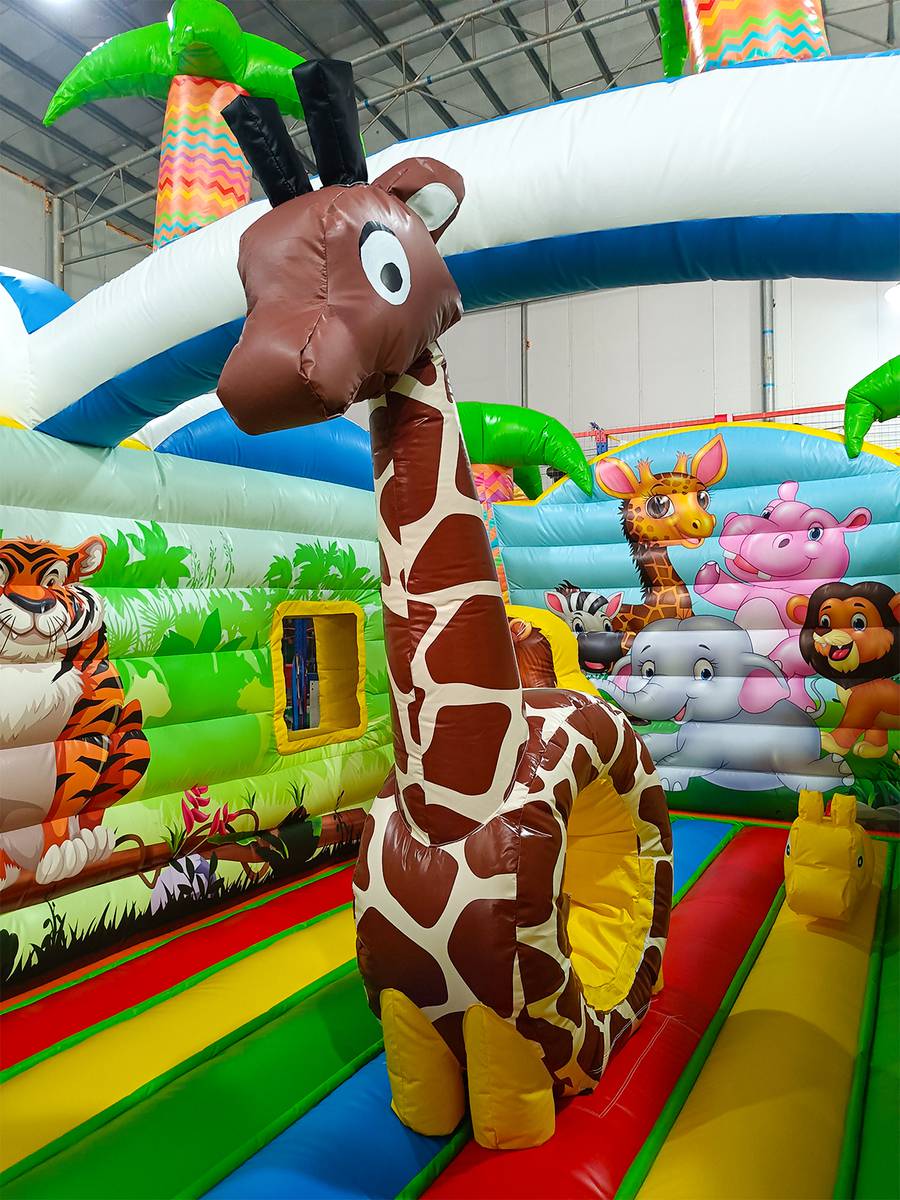 Экзотический эффектный батут «Заповедник» изготовлен в виде прямоугольного домика с полупрозрачными стенами. Вход внутрь выполнен из сетчатой материи с арочным проемом внутри, сверху передней стены аттракциона установлены надувные фигуры зверей. Боковые столбы, составляющие основу батута, оформлены в виде надувных пальм, а по бокам нанесены красочные рисунки обитателей джунглей.