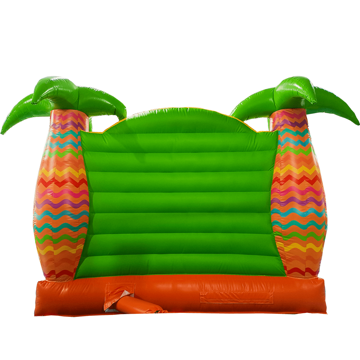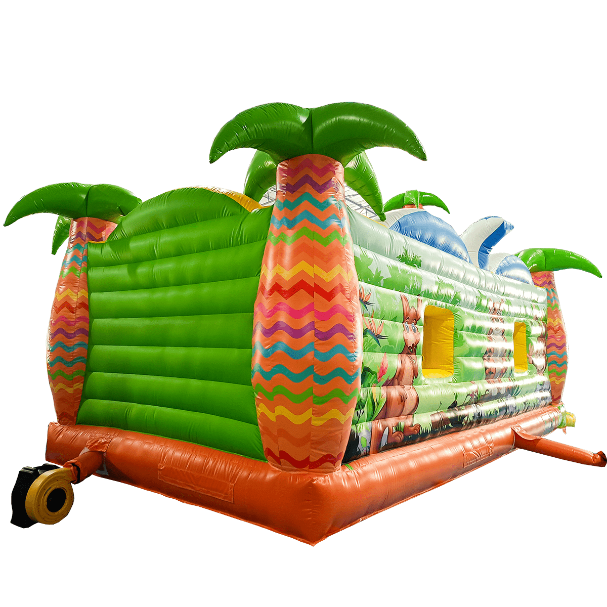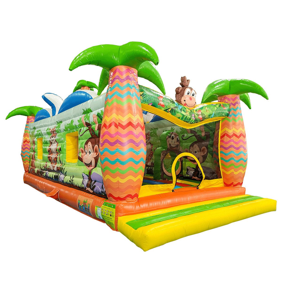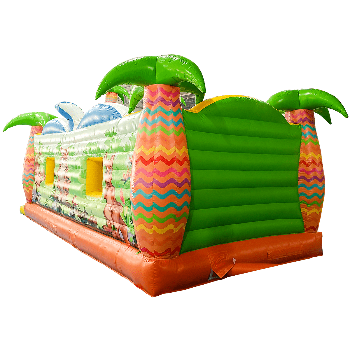 Экзотический эффектный батут «Заповедник» изготовлен в виде прямоугольного домика с полупрозрачными стенами. Вход внутрь выполнен из сетчатой материи с арочным проемом внутри, сверху передней стены аттракциона установлены надувные фигуры зверей. Боковые столбы, составляющие основу батута, оформлены в виде надувных пальм, а по бокам нанесены красочные рисунки обитателей джунглей.