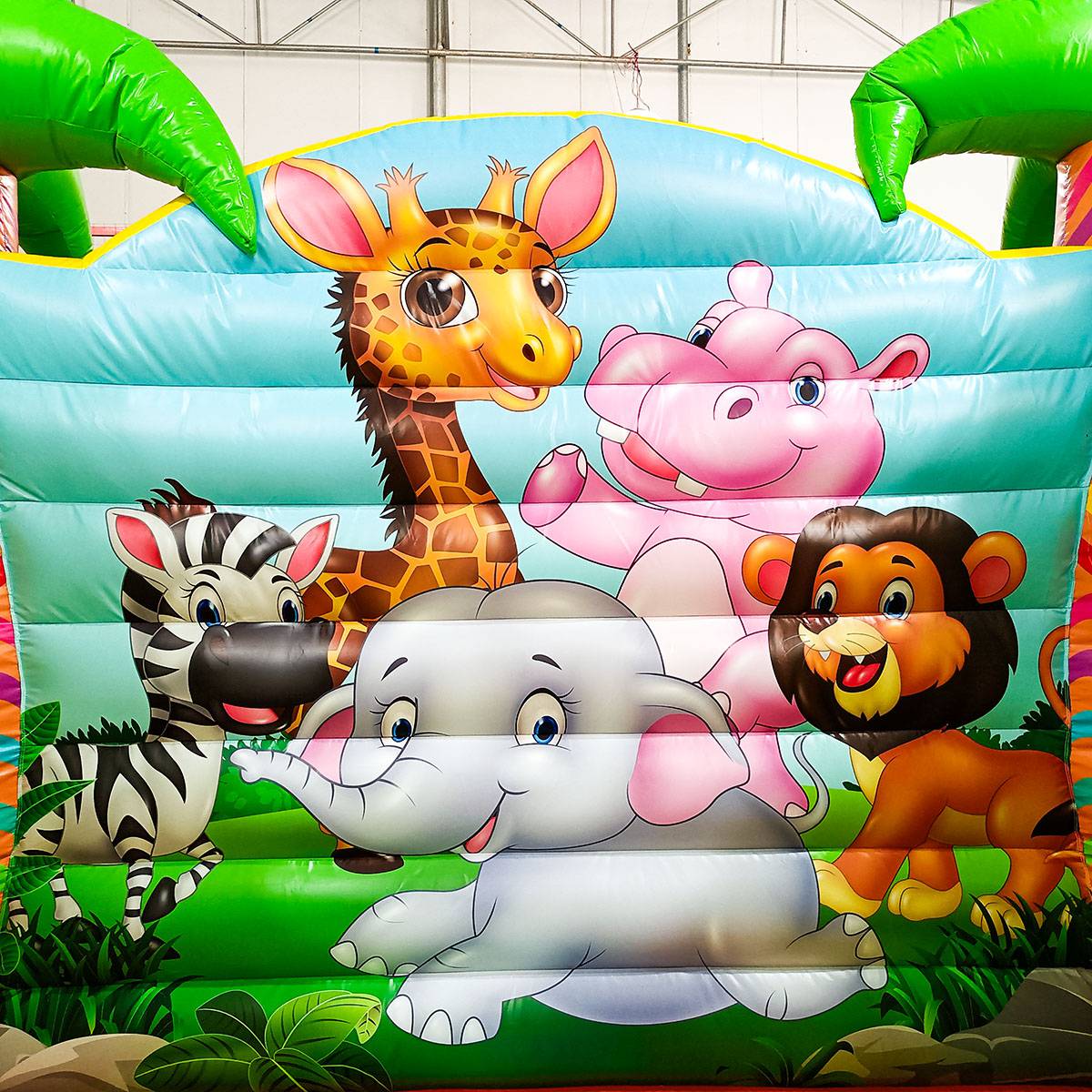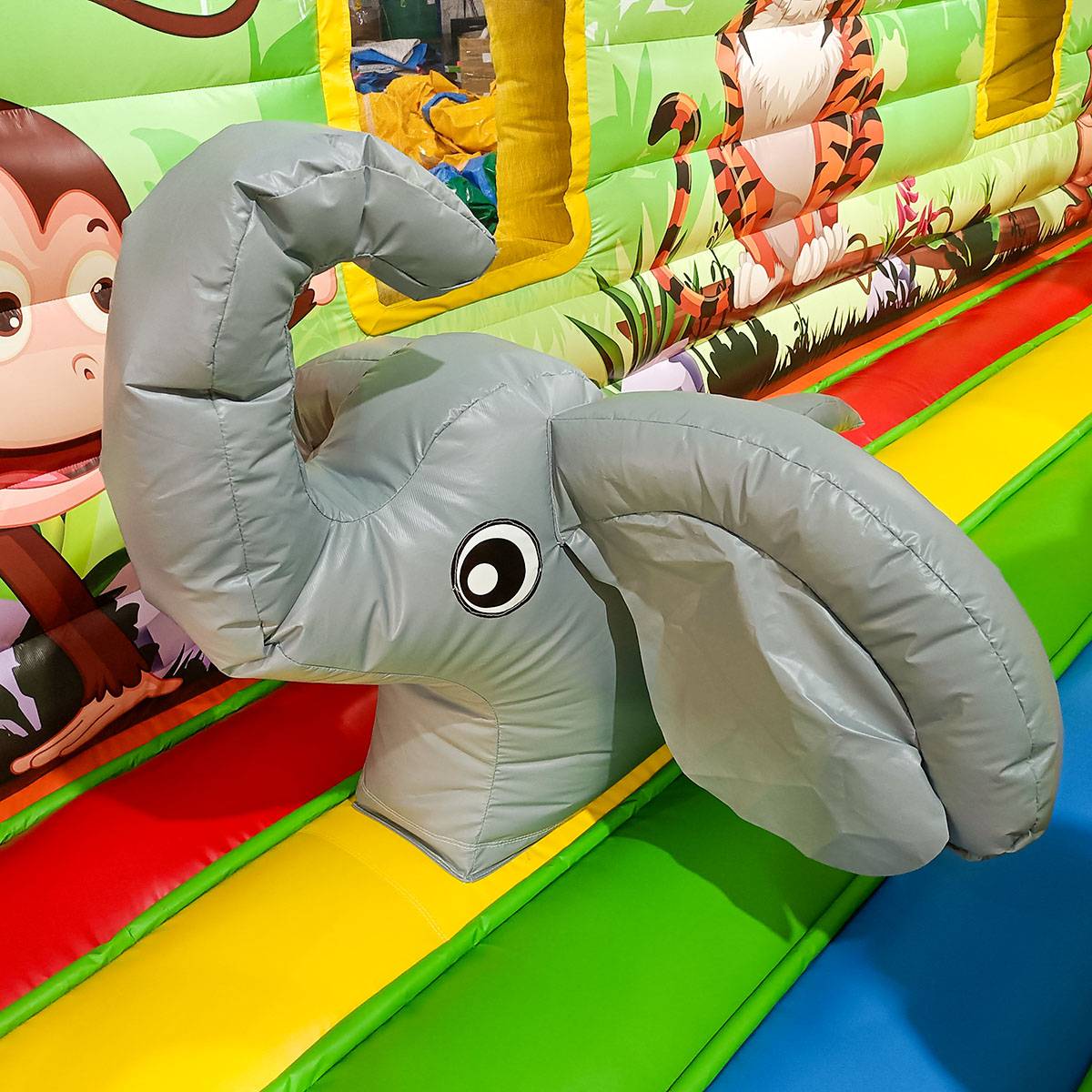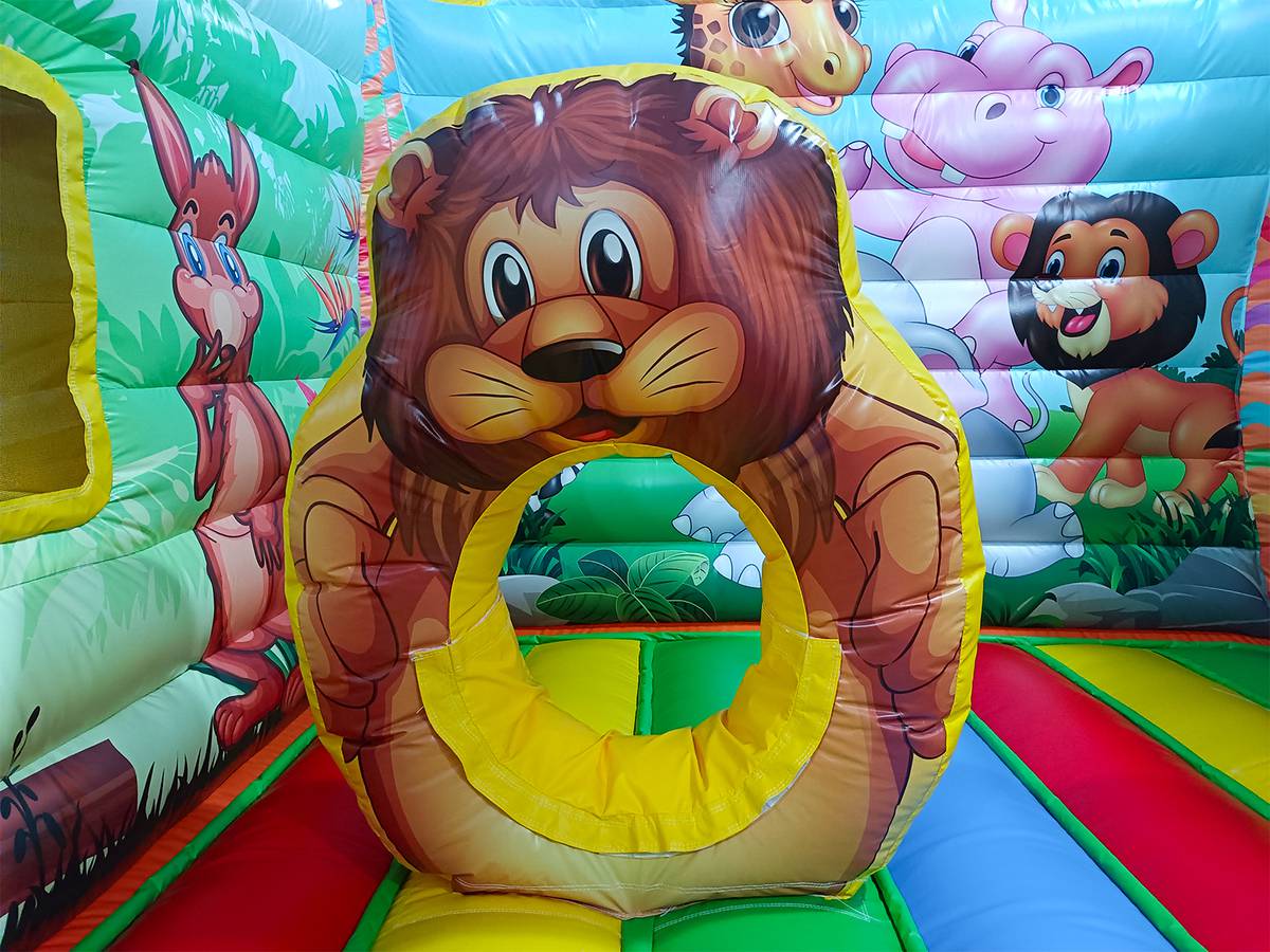 Попадая внутрь, малыши увидят ожидающего их большого надувного слона, различные спортивные снаряды в форме зверей – арочные кольца в виде зебры, мягкого бегемота для прыгания, столбики и пуфы из фигурок животных. Остается еще достаточно свободной площади для прыгания и бега, чтобы малыши могли выплеснуть лишнюю энергию.