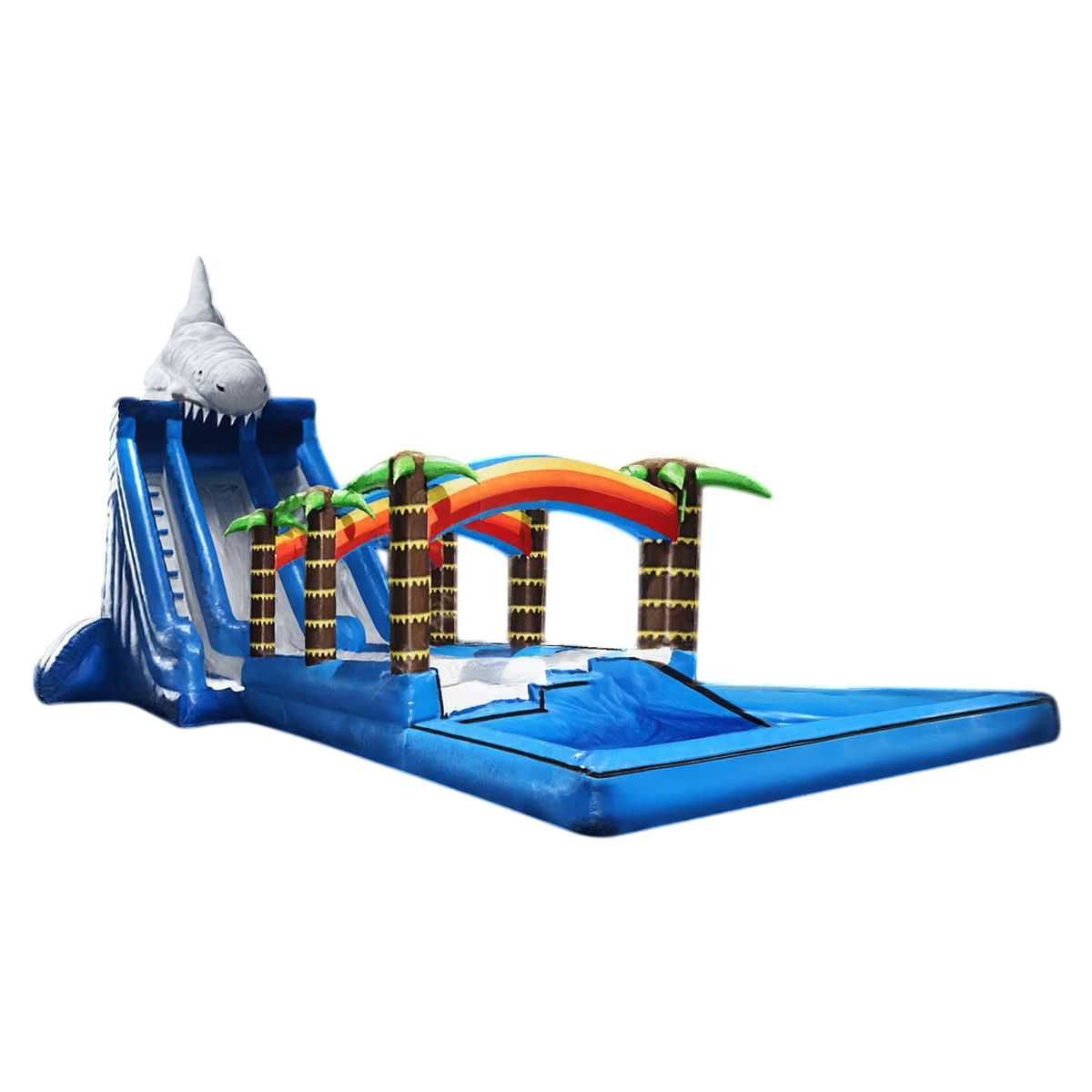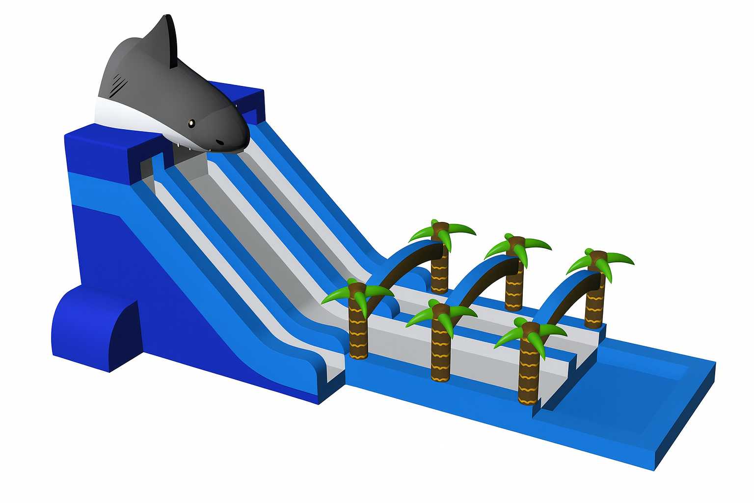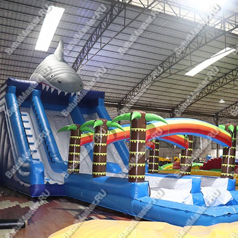 Водная горка «Акула на спуске» — это настоящий магнит для посетителей! Её узнаваемый дизайн с фигурой акулы, радужными арками и глубоким бассейном создаёт атмосферу веселья и драйва, где дети и взрослые получают море эмоций и незабываемых впечатлений. Размер конструкции — 15×5×8 м, что делает её идеальным решением для крупных и средних площадок.