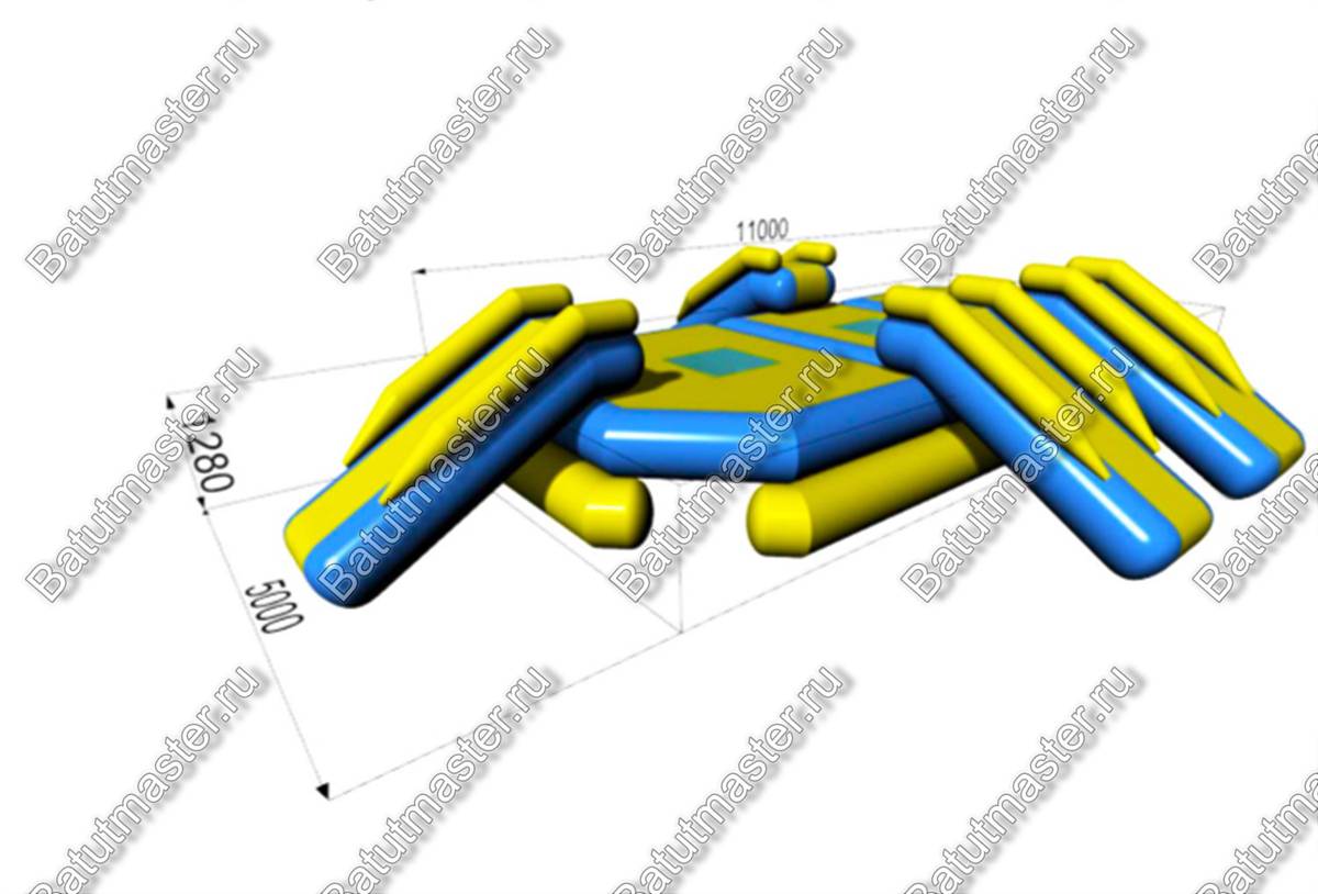 Модуль изготовлен из прочного армированного ПВХ толщиной 0,9 мм и плотностью 1100 г/м², что обеспечивает устойчивость к проколам, износу, солнечным лучам, хлору и морской воде. Все швы сварены внахлёст шириной 2,5 см, что гарантирует надёжную герметичность. Горки и края конструкции имеют мягкое покрытие, снижающее риск получения травм.