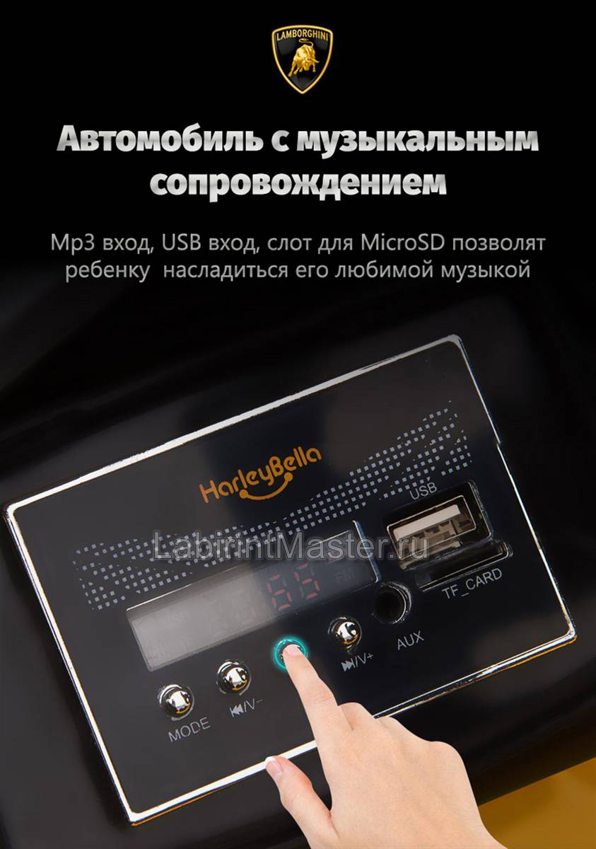 Детский электромобиль «Lamborghini Aventador SVJ» разместит внутри сразу двоих малышей, так как тут имеется широкое удобное кресло из эко-кожи с подголовниками. Колеса из вспененной резины не скользят на мокром дорожном покрытии, а также отлично сцепляются с грунтом или травой.