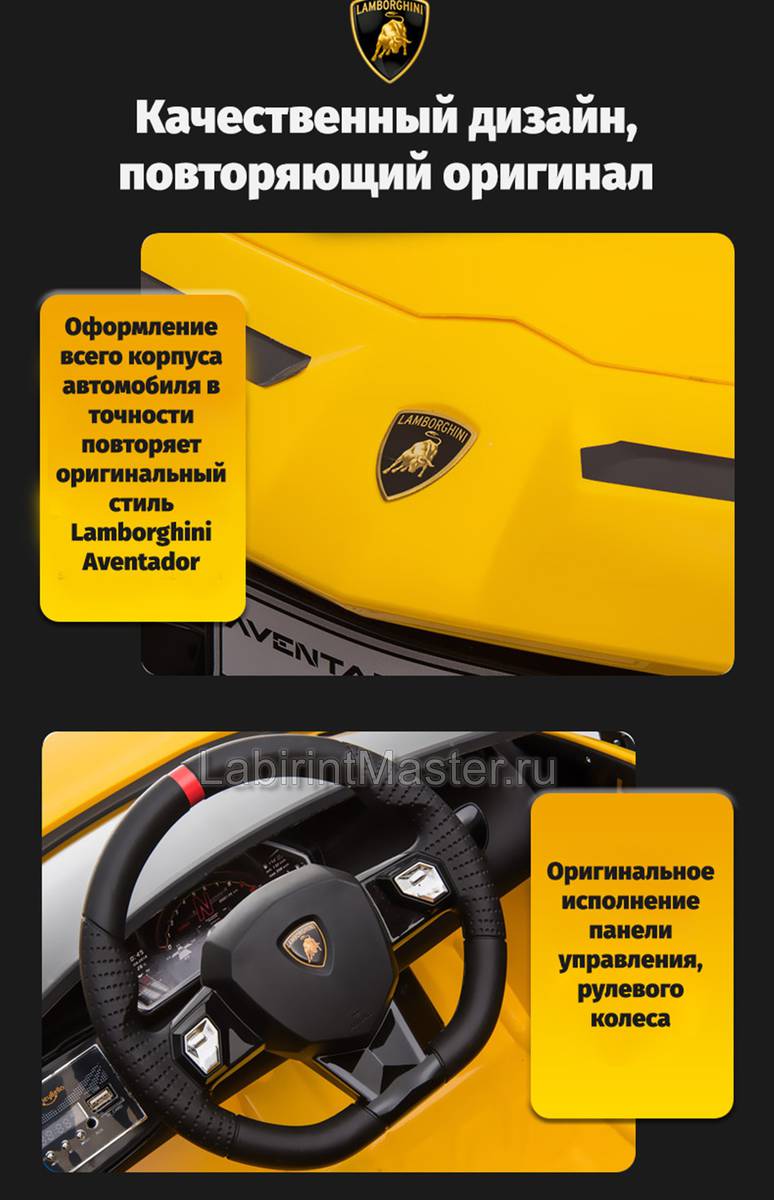 Стильный детский электромобиль «Lamborghini Aventador SVJ» произведет самые приятные впечатления на каждого ребенка. В этой машинке есть все самые интересные и современные функции, чтобы вождение было комфортным и интересным. Желтый цвет кузова выделяется среди остальных машинок и становится заметным издалека. Двери здесь открываются наверх, что поистине удивляет. Внутри каждой из них имеется замок-защелка от случайного их распахивания.