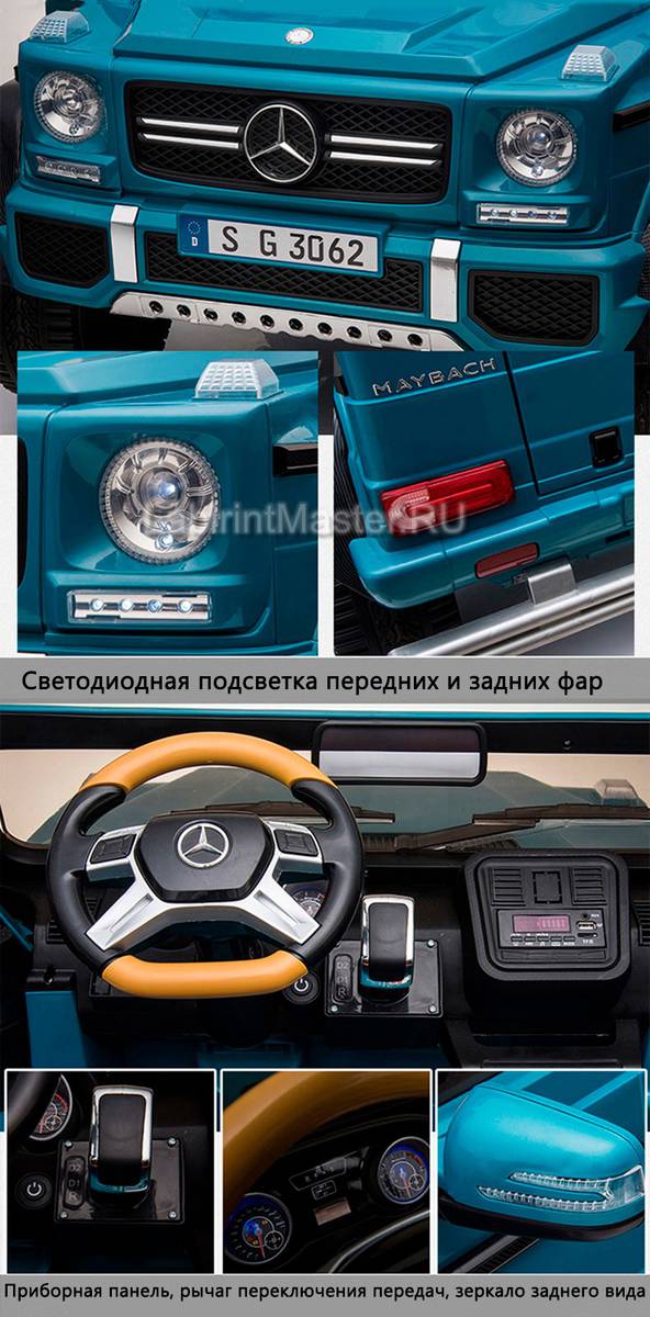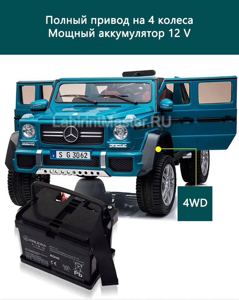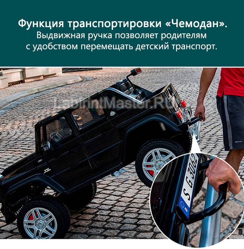 Детский электромобиль «Mercedes» G650 сделан в приятном синем цвете и непременно притянет к себе взгляд. Транспортировать авто можно как чемодан за длинную удобную ручку сзади. На руле есть множество кнопок и клаксон. Светодиоды позволят легко кататься в полной темноте.