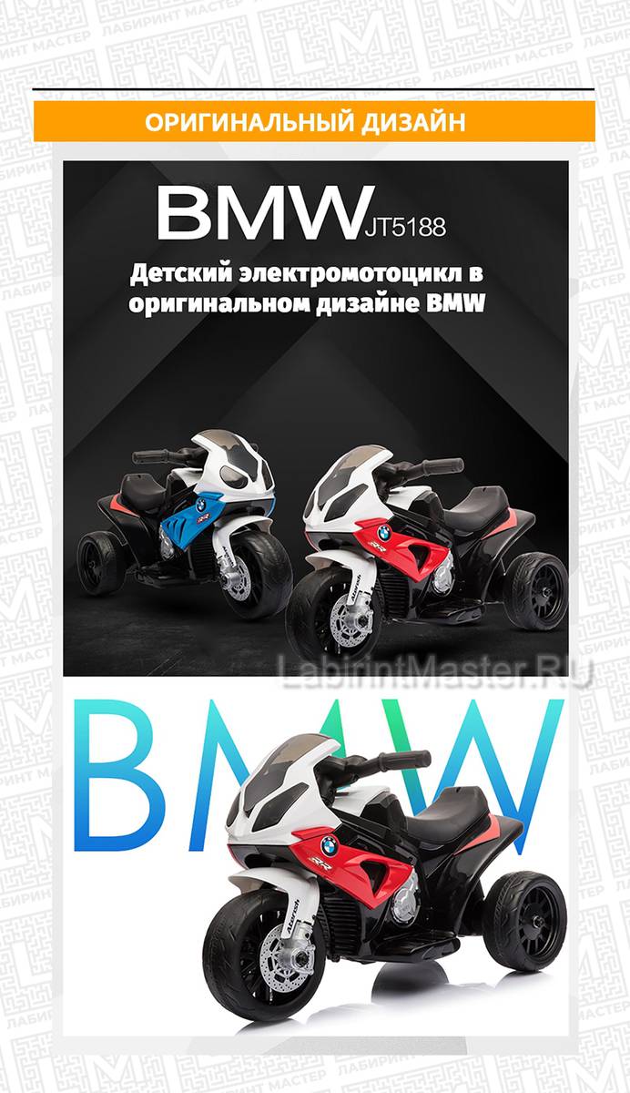 Стать водителем такого стильного, спортивного транспорта – мечта каждого юного гонщика. Детский электромотоцикл BMW S1000RR позволит получить незабываемые эмоции и море удовольствия. В нем есть все, что только может быть в настоящем мотоцикле для взрослых известной премиальной марки. Стоит заметить наличие настоящих фирменных эмблем и значков, которые и делают такой транспорт узнаваемым. Каучуковые колеса обеспечат плавный ход.