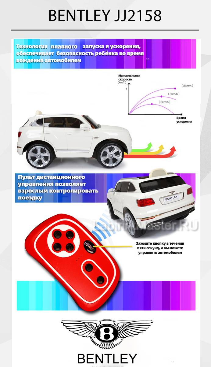 Детский электромобиль Bentley JJ2158 оснащен подсветкой панели приборов и звуковыми эффектами.