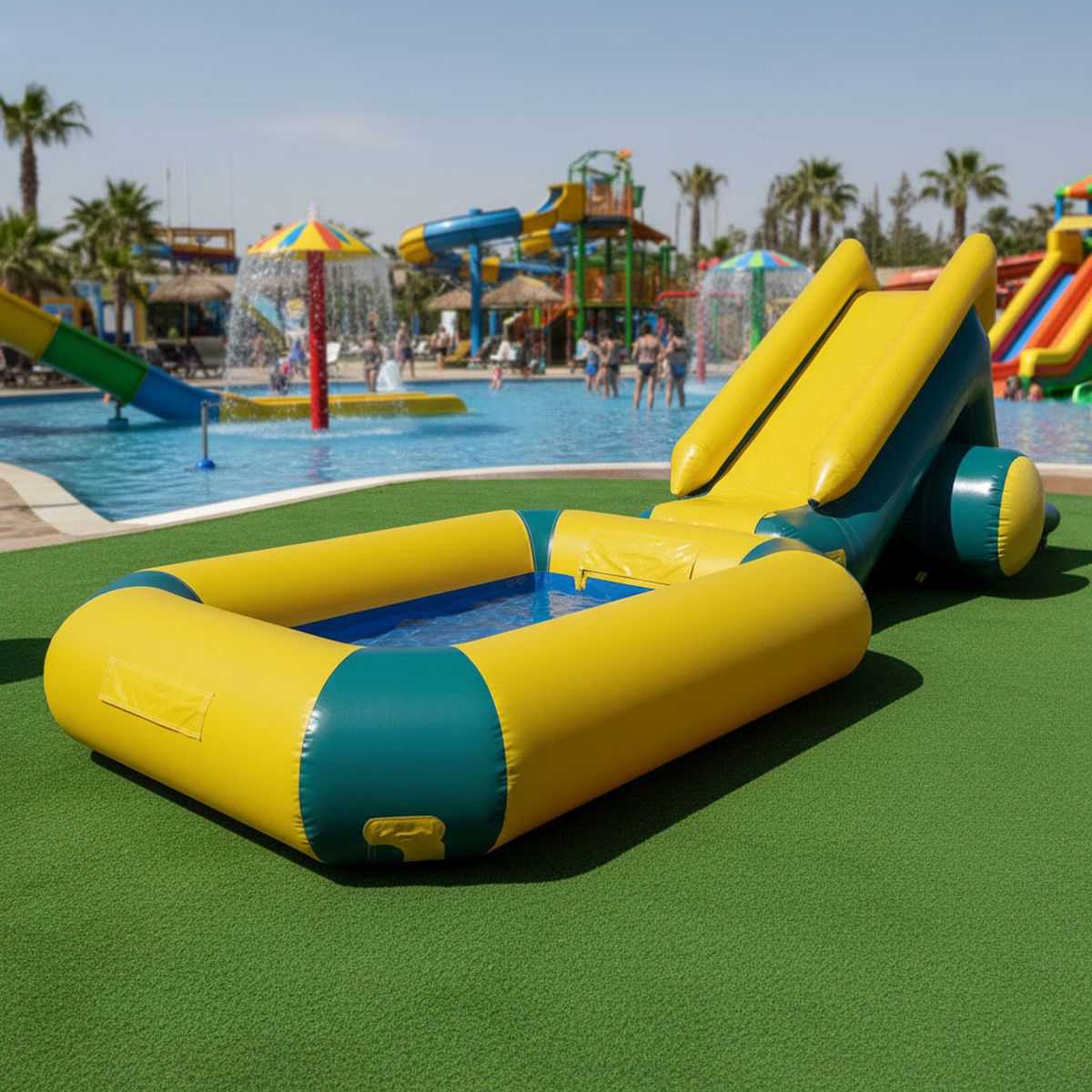 Яркий жёлтый цвет с зелёными акцентами моментально привлекает внимание и создаёт атмосферу летнего веселья. Это не просто аттракцион, а полноценный мини-аквапарк, который способен стать центром притяжения для детей и семейных посетителей.