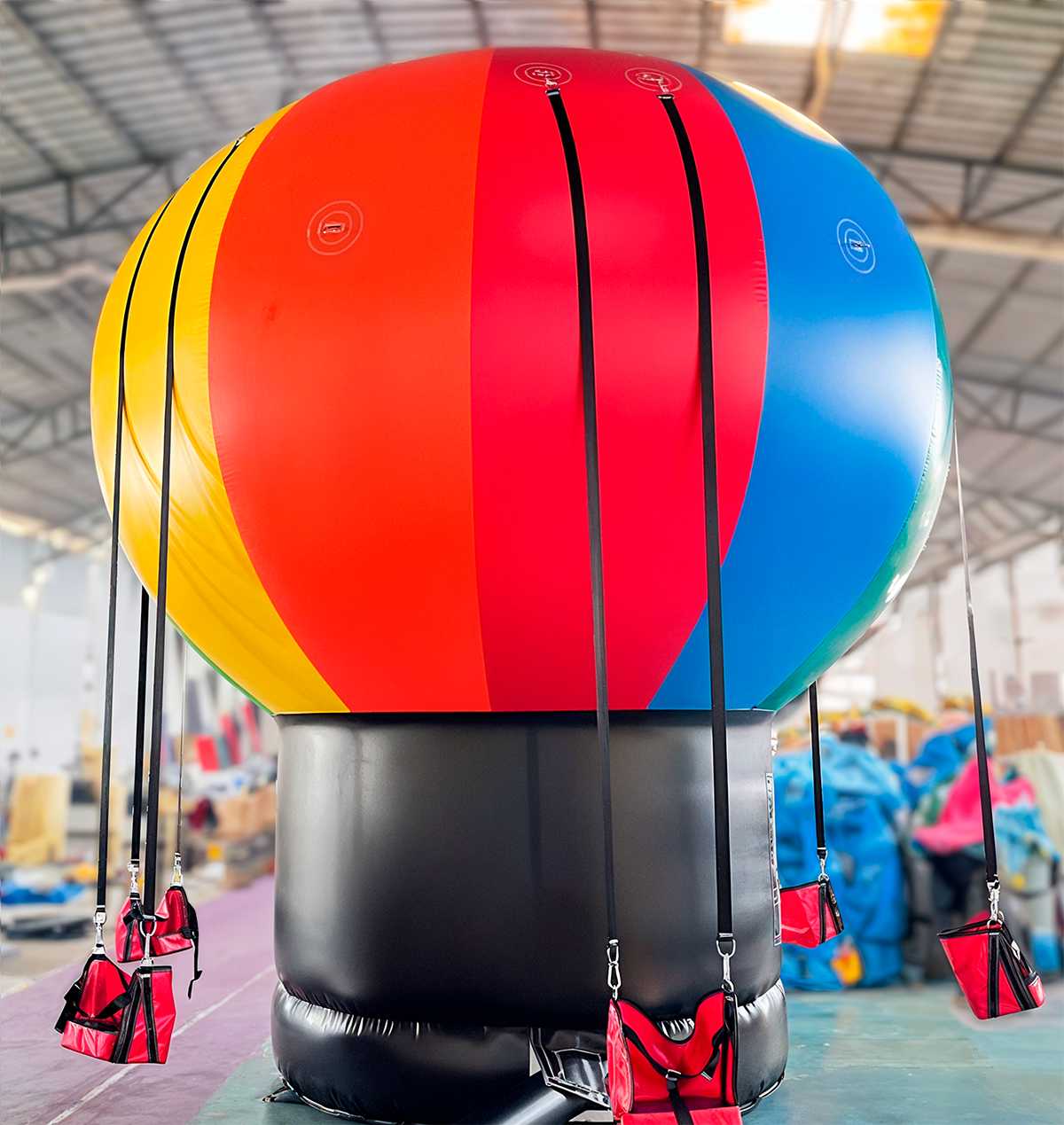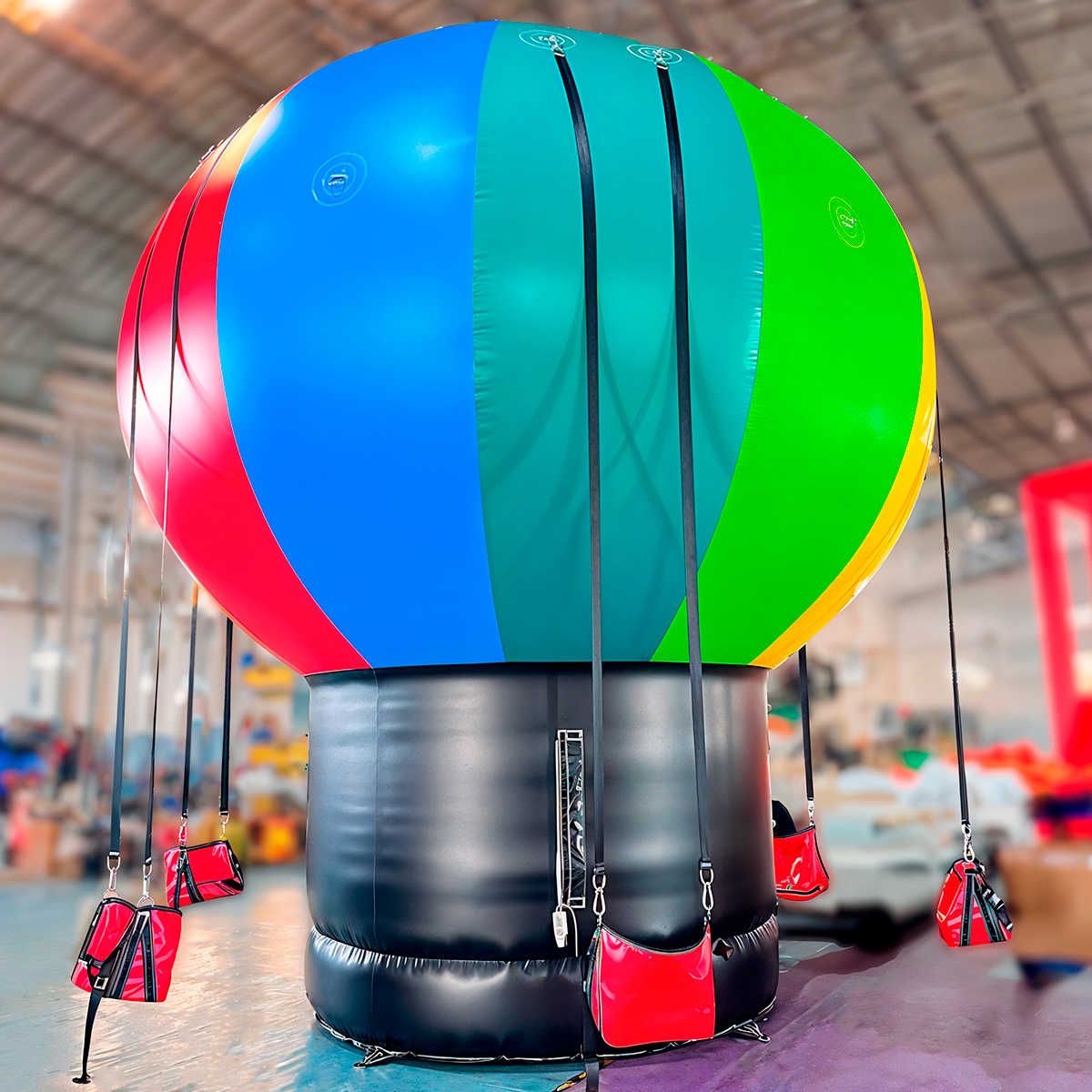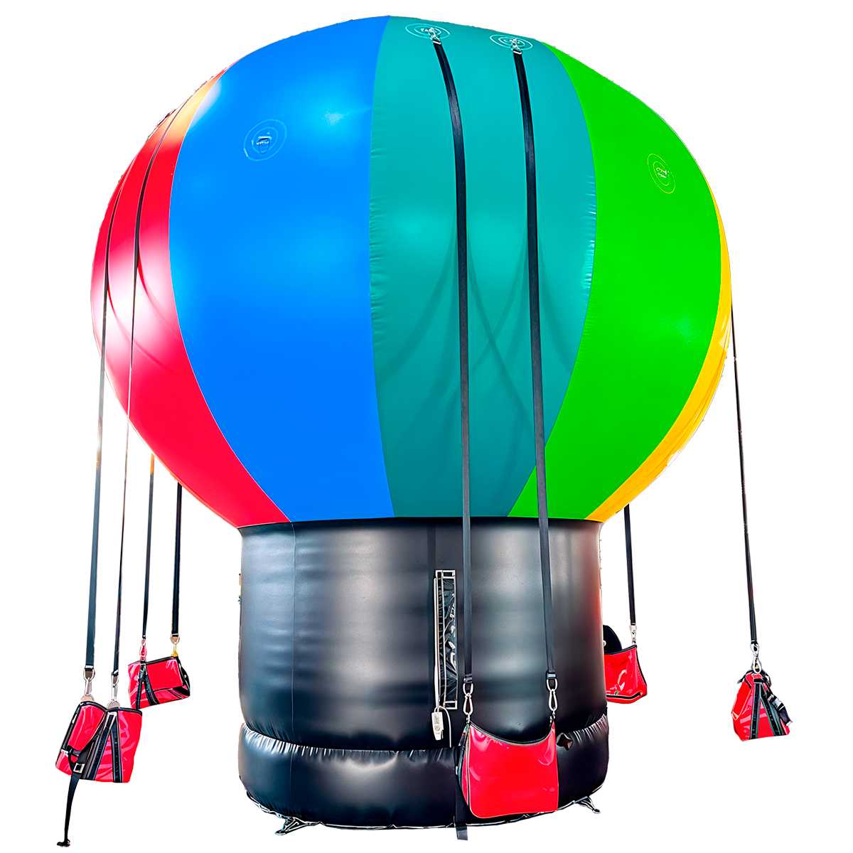 Принцип работы простой: купол воздушного шара надувается насосом и держит форму за счёт постоянного давления воздуха. Внутри купола к прочным креплениям подвешены сиденья на надёжных ремнях. Гости садятся, фиксируются, и раскачиваются вперёд-назад, как на классических качелях, отталкиваясь от стенки купола. Всё безопасно: сиденья прочно держатся, а оболочка устойчива и мягко амортизирует.