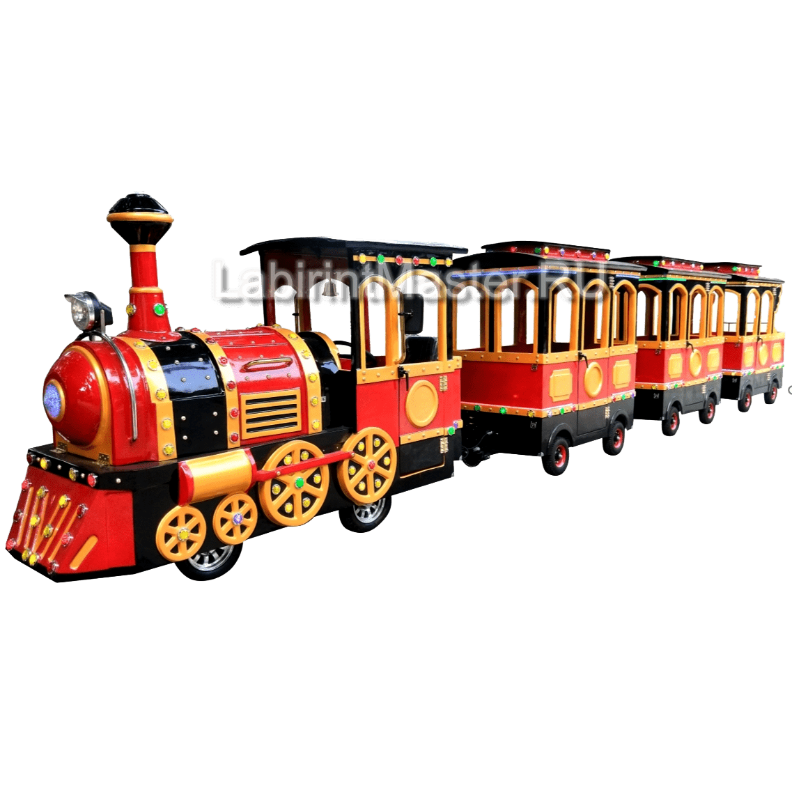 Безрельсовый поезд выполнен в ретро-стиле, напоминающем классический паровоз. Основные цвета – красный, черный и золотистый, с декоративными элементами и подсветкой.