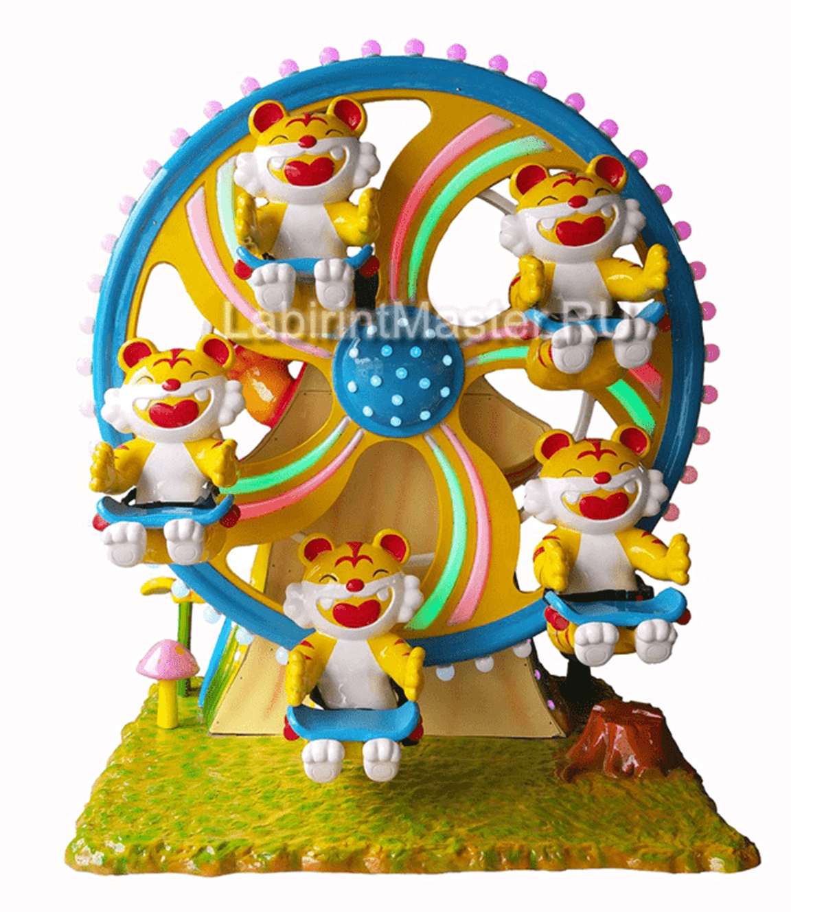 Дизайн карусели поражает своей оригинальностью. В центре конструкции находится вращающееся колесо с пятью посадочными местами, выполненными в виде ярких тигрят. Каждое место оснащено удобными и безопасными сиденьями, которые позволяют детям наслаждаться катанием с максимальным комфортом. Яркие цвета и милые выражения "лиц" тигрят мгновенно привлекают внимание и создают атмосферу праздника. Особую роль играет встроенная светодиодная подсветка, которая делает карусель особенно эффектной в вечернее время, когда она сияет всеми цветами радуги, завораживая детей и их родителей.