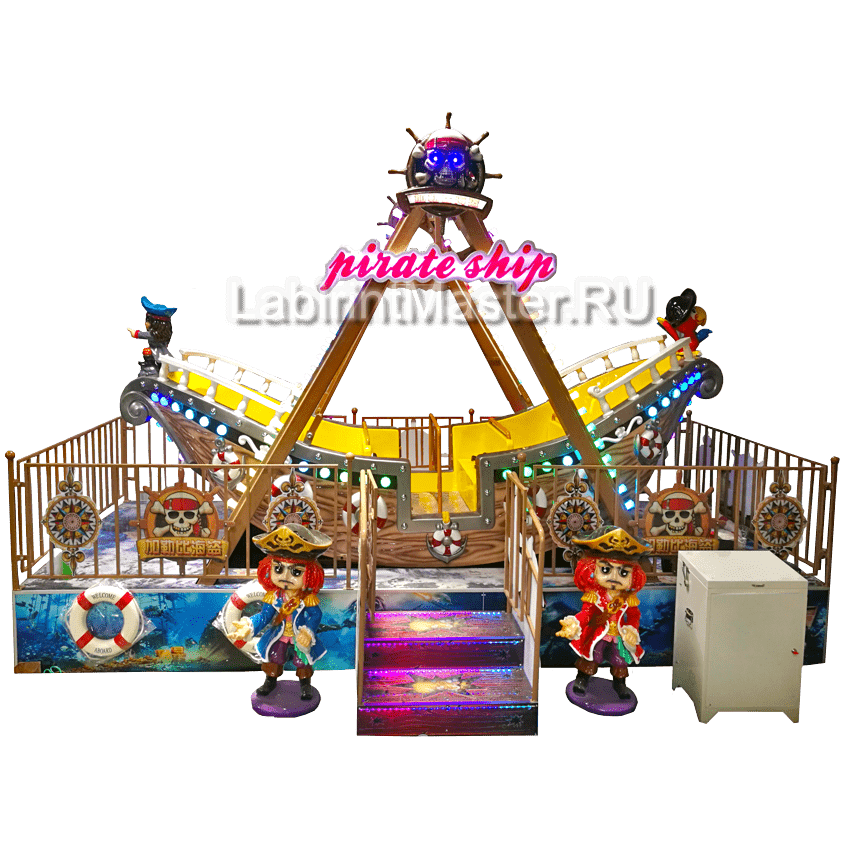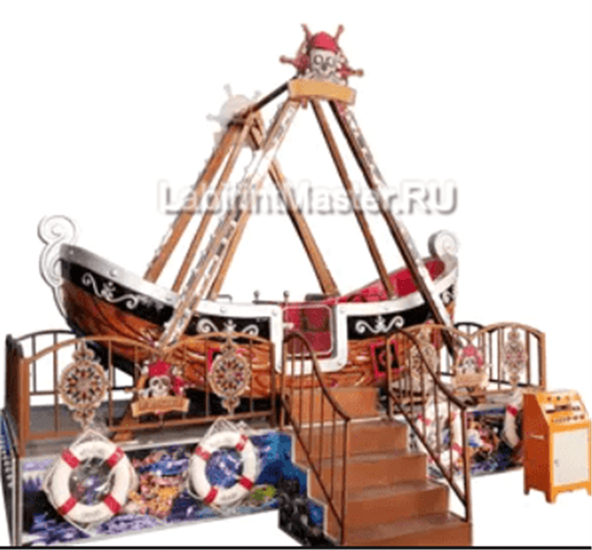 Аттракцион выполнен в виде массивного пиратского корабля, который раскачивается на платформе, создавая эффект морских волн. Украшенный светодиодными лампочками, он особенно впечатляет в вечернее время, создавая атмосферу праздника и приключений. Элементы декора включают пиратские символы, такие как черепа, штурвалы и спасательные круги, что усиливает тематическую направленность. Для создания полного погружения в мир пиратов, аттракцион оснащен звуковыми эффектами, напоминающими шум моря и крики пиратов.