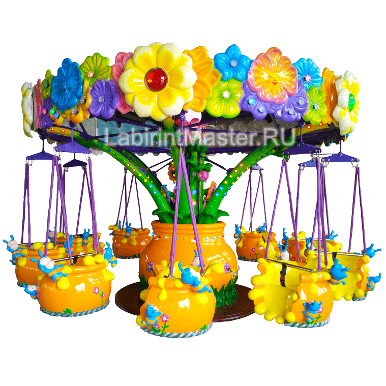 Цепочная карусель "Медовые бочонки"— это воплощение ярких красок, детской радости и безопасности в одном аттракционе. Уникальный дизайн карусели, выполненный в тематике природы, делает её настоящей изюминкой любой развлекательной зоны. Верхняя часть карусели оформлена в виде большого цветочного венка с множеством разноцветных цветов, которые привлекают внимание издалека. Сиденья выполнены в виде забавных "медовых бочонков", украшенных изображениями насекомых и природных мотивов. Такой дизайн создаёт атмосферу сказки, где каждый ребёнок чувствует себя частью волшебного мира.