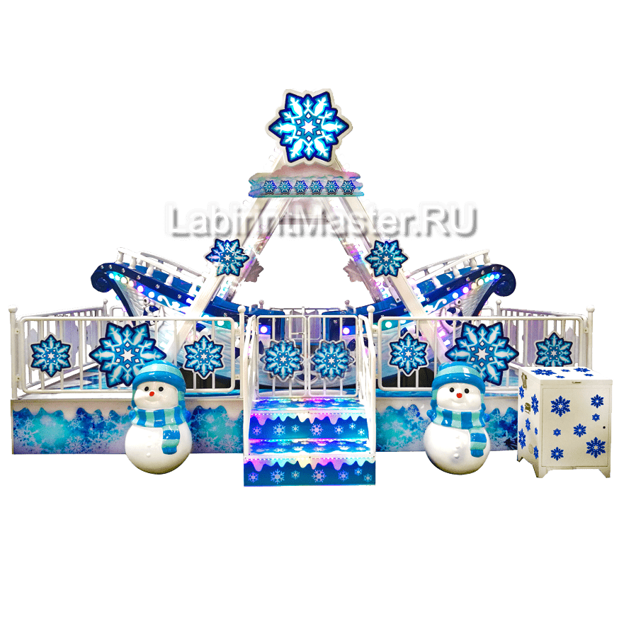 Центральное место в оформлении занимает большая снежинка, расположенная наверху конструкции, которая задаёт общее настроение всему аттракциону. По бокам, у входа, посетителей встречают два симпатичных снеговика с добрыми улыбками, добавляя в атмосферу весёлую нотку и создавая ощущение уюта. Вся карусель оформлена в зимних цветах – белом, голубом и синем, что подчёркивает её принадлежность к теме снега и морозного волшебства.