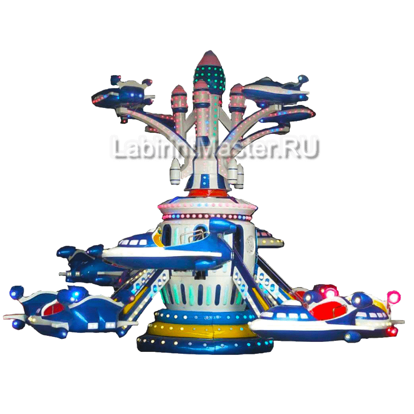 Важной особенностью карусели является ее световое оформление. На центральной башне, платформах и самих кораблях расположены разноцветные светодиоды, которые создают динамичные световые эффекты, переливаясь и мерцая. В ночное время эта подсветка привлекает внимание издалека, делая карусель неотъемлемым центром любой развлекательной зоны. Звуковое сопровождение дополняет общее впечатление: тематические звуки, напоминающие запуск ракеты, и веселая музыка создают атмосферу настоящего космического старта.