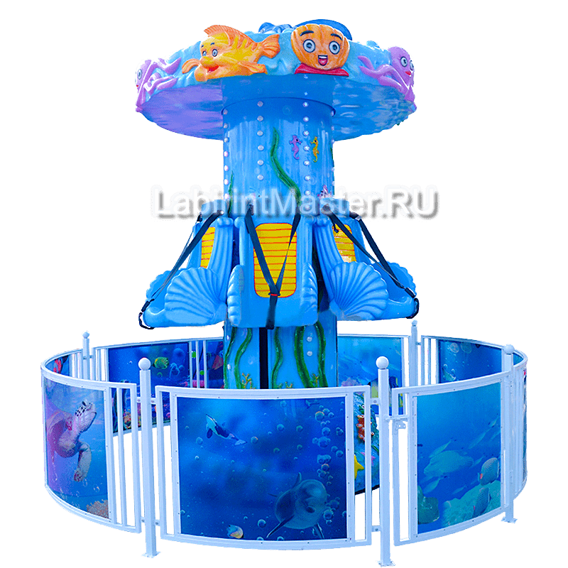 Карусель выполнена в насыщенной морской тематике: голубые и синие оттенки преобладают в оформлении, создавая ассоциации с океанскими глубинами. Центральная колонна аттракциона стилизована под подводный коралловый риф, украшенный изображениями водорослей и других морских элементов. Верхнюю часть украшают забавные персонажи — улыбающиеся рыбки, осьминоги и другие подводные жители, которые буквально «оживают», приглашая детей на увлекательное путешествие.