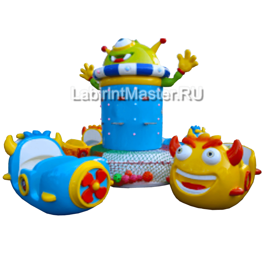 Центральный элемент карусели, большой зелёный монстрик с приветливой улыбкой и забавным выражением лица, вызывает восторг у детей. Он словно приглашает всех прокатиться на удивительном аттракционе. Вокруг центрального персонажа располагаются яркие посадочные места в форме фантастических машинок монстриков. Каждое место имеет уникальную форму и детали: мультяшные глаза, пропеллеры, декоративные элементы и насыщенные цвета. Такая карусель не просто привлекает внимание, она создаёт атмосферу праздника и радости, наполняя пространство яркими эмоциями.