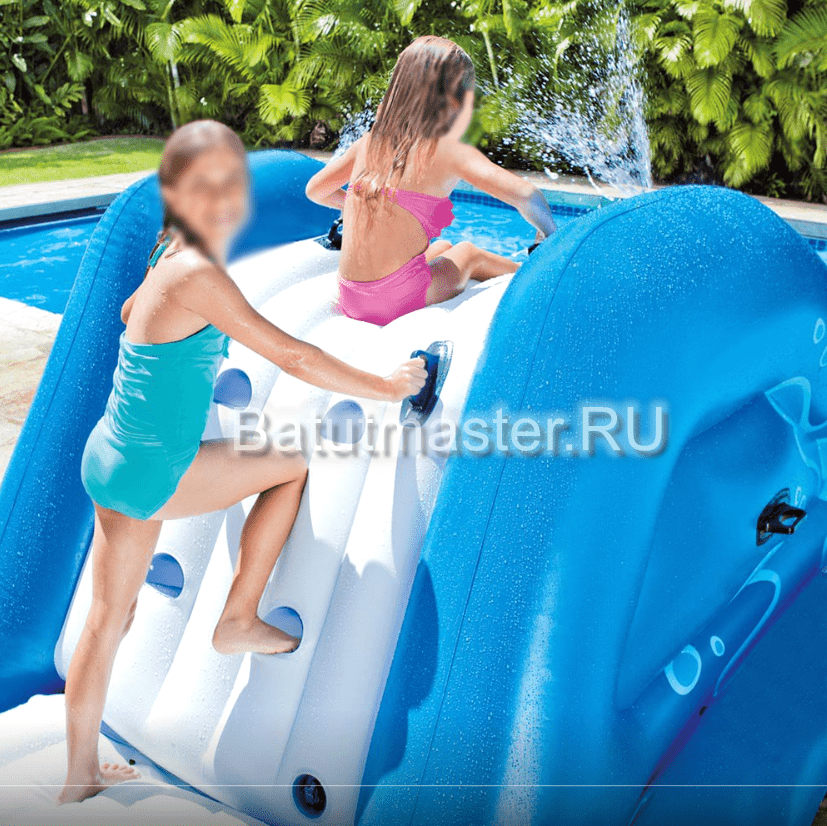 Горка изготовлена из армированного ПВХ толщиной 0,9 мм и плотностью 1100 г/м². Такой материал отличается высокой прочностью, устойчивостью к механическим нагрузкам и неблагоприятным погодным условиям. Он не теряет эластичности при температуре от -15 до +60 °С и надежно защищен от воздействия солнечных лучей и хлорированной воды.