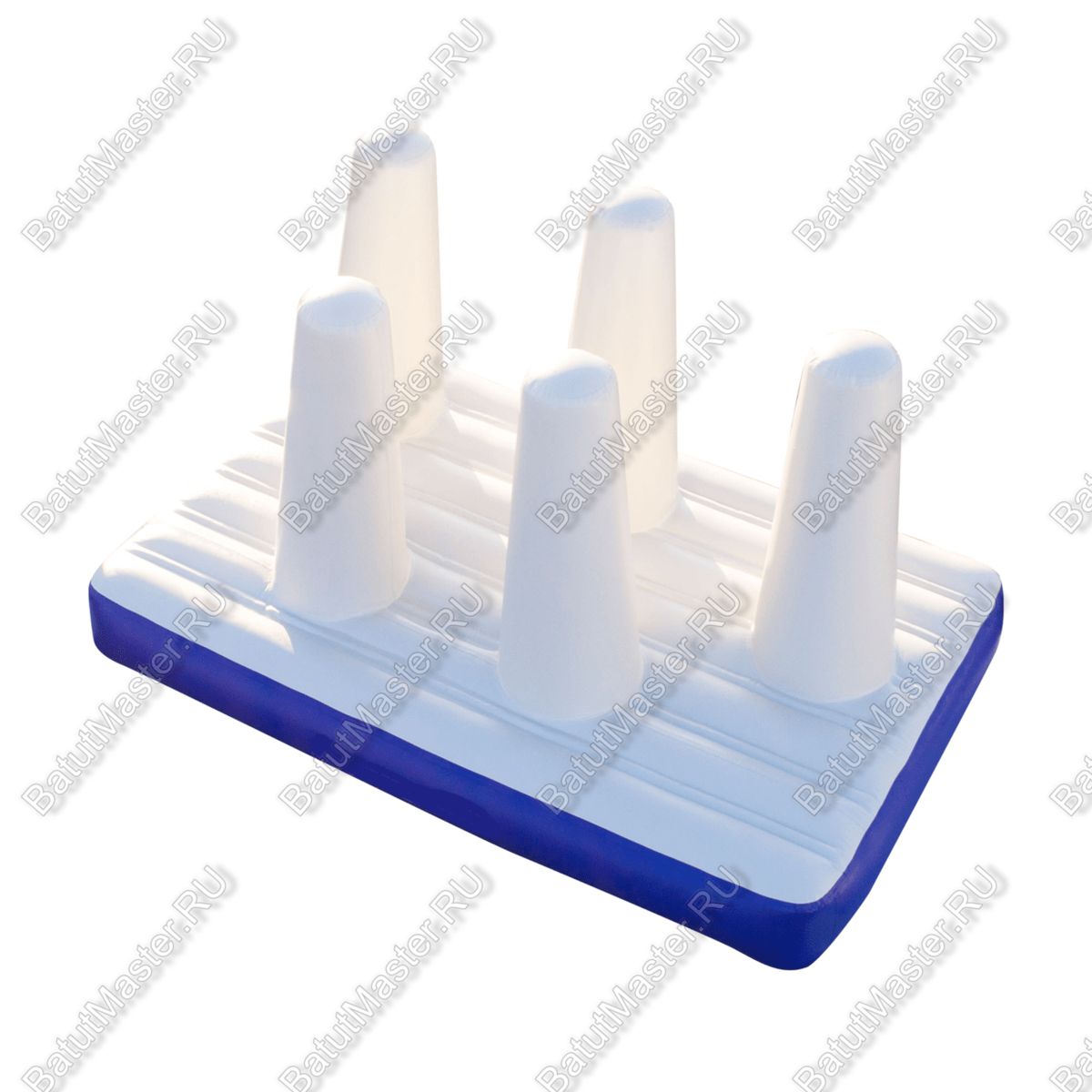 Элемент аквапарка «Баррикада» — это надувная конструкция, выполненная в стильных бело-синих тонах. Размеры 3×2×1,5 м делают её достаточно компактной для установки в ограниченном пространстве акватории и в то же время вместительной для одновременного использования несколькими участниками. Особенность конструкции заключается в вертикальных конусообразных элементах, которые образуют игровое поле для балансировки, прыжков и преодоления препятствий.