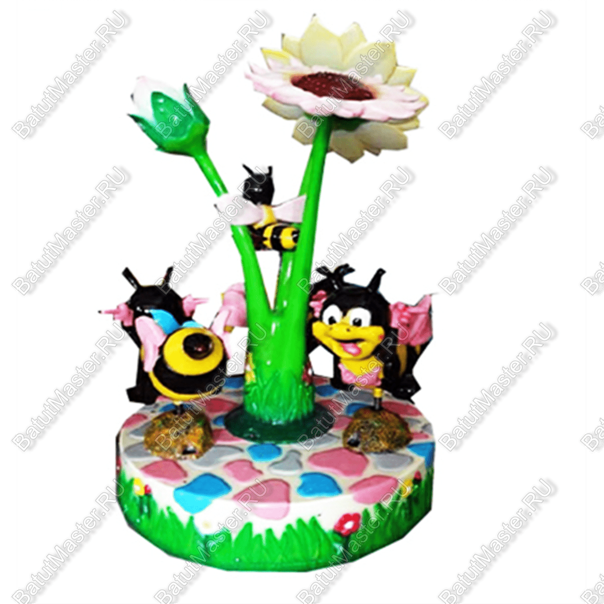 Дизайн карусели выполнен в тематике веселых пчел, привлекающих внимание детей и вызывающих у них восторг. Основные цвета – жёлтый, зелёный, голубой– создают яркую и веселую атмосферу. Центральная ось оформлена в виде цветка, а посадочные места стилизованы под улыбающихся пчелок. Такое оформление способствует развитию у детей положительных эмоций, вовлекает их в игровой процесс и делает пребывание на аттракционе увлекательным.