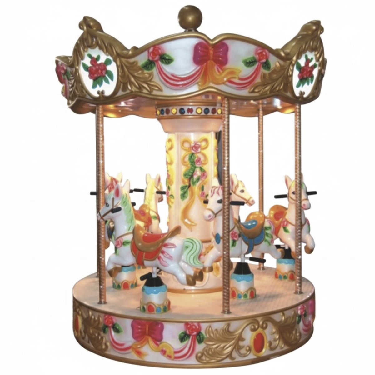 С первого взгляда карусель "Весёлая игра" очаровывает своим дизайном. Её золотистый купол украшен изящными узорами и яркими цветочными элементами, которые придают конструкции элегантность и утончённость. Цветочные мотивы и мягкий свет привносят атмосферу праздника и волшебства. Нижняя часть карусели декорирована орнаментами, подчеркивающими её классический стиль. А милые лошадки с яркими гривами и красочными седлами расположены на вращающейся платформе, создавая ощущение, будто они готовы унести детей в сказочное путешествие.