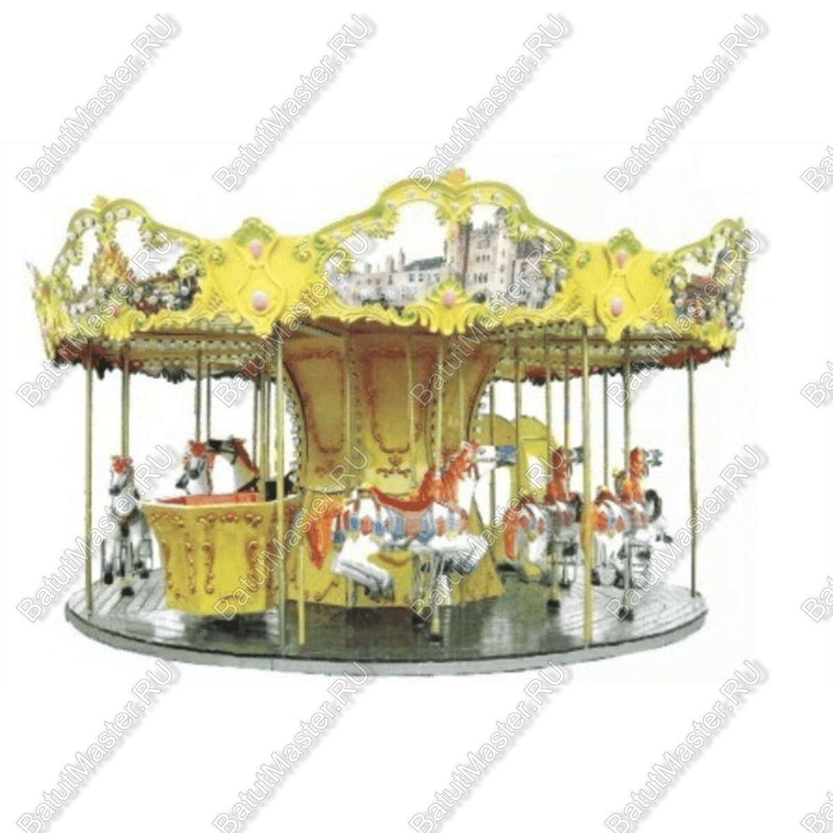 Электрическая карусель "Всадник" – это уникальный аттракцион, который сочетает в себе изысканную элегантность классического дизайна и современные технологии. Карусель выполнена в насыщенных золотисто-жёлтых тонах, дополненных зелёными элементами и аккуратными декоративными узорами. Эти цвета не только выделяют её среди других аттракционов, но и создают ощущение праздника, поднимая настроение всем окружающим. Верхняя часть карусели украшена изысканными элементами и картинами с изображениями сказочных замков и живописных пейзажей, что добавляет ей очарования и создает атмосферу волшебного путешествия.