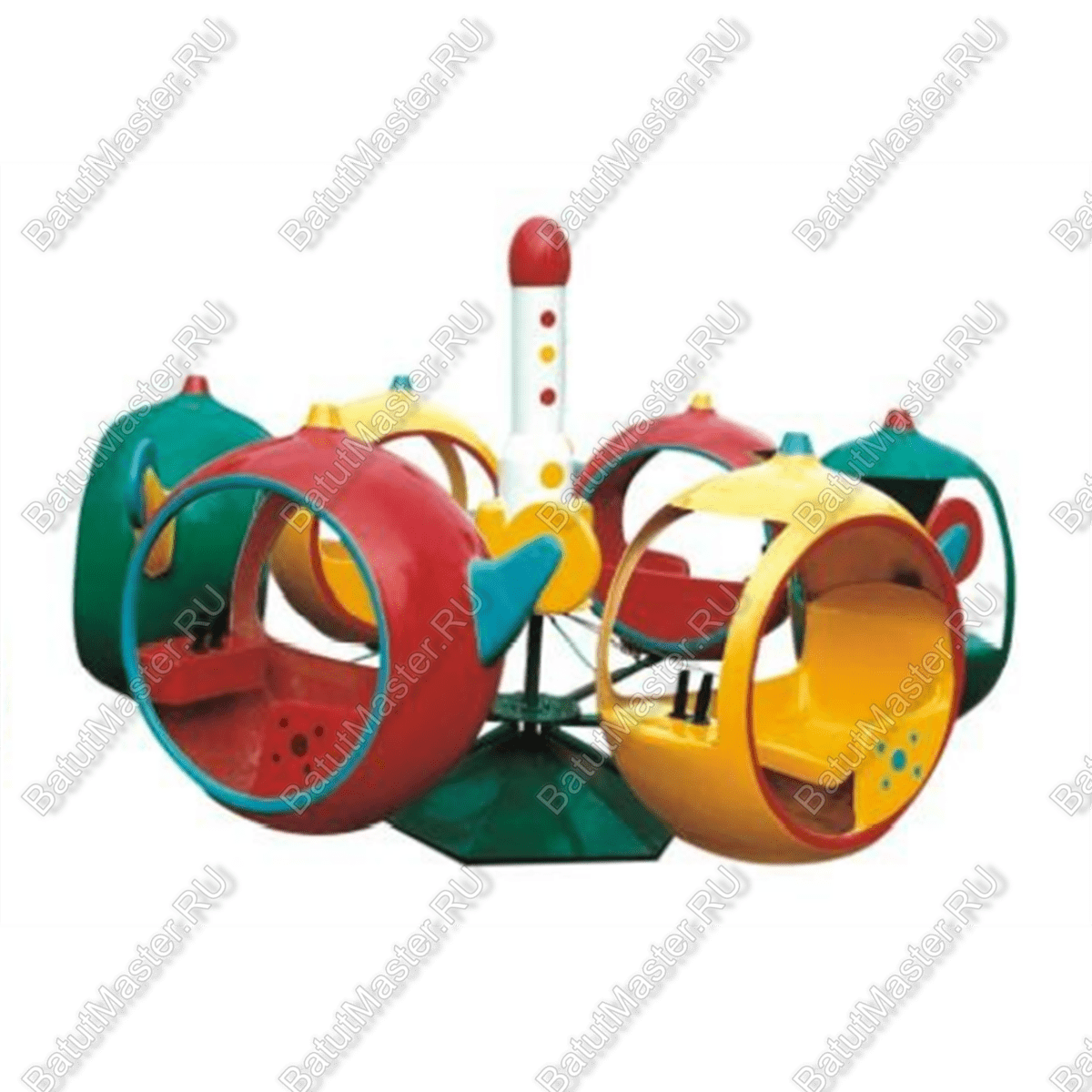Внешний вид карусели сразу привлекает внимание благодаря своему космическому дизайну. Посадочные места выполнены в виде обтекаемых кабин, напоминающих транспортные капсулы. Эти кабины окрашены в насыщенные цвета – ярко-желтый, красный и зеленый, что делает карусель заметной издалека. На каждой кабине предусмотрены удобные кресла, чтобы дети чувствовали себя комфортно и безопасно. Центральная часть карусели стилизована под космическую ракету, добавляющую тематический акцент. Такая стилистика вызывает восторг как у детей, так и у их родителей.