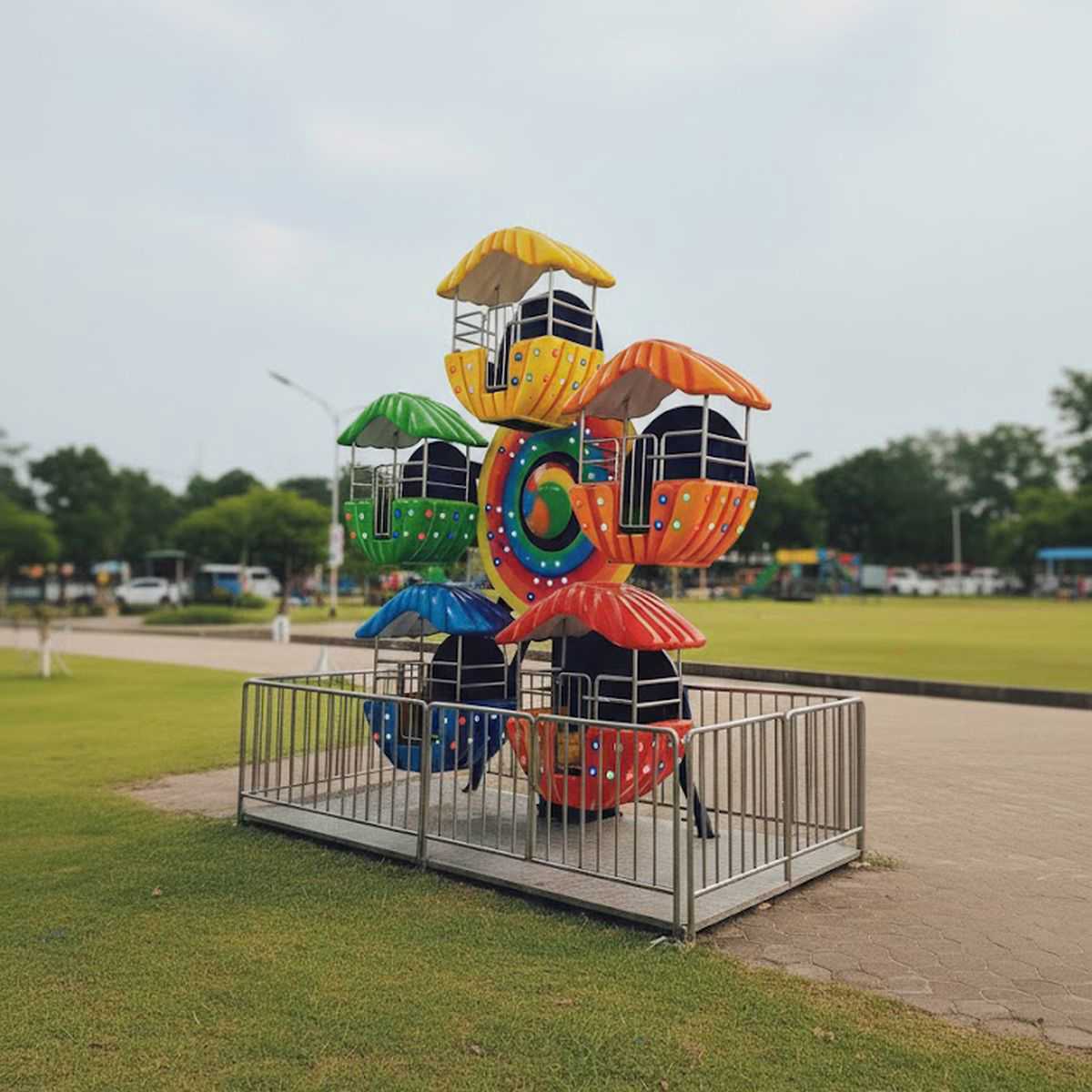 Основой карусели является платформа, которая обеспечивает устойчивость и безопасность конструкции. Каждое посадочное место выполнено с учетом эргономики и безопасности. Они оборудованы прочными поручнями, обеспечивающими надежную фиксацию, что особенно важно для родителей, доверяющих оборудование своим детям. Открытые и просторные кабины дают детям возможность наслаждаться видом и чувствовать себя комфортно.