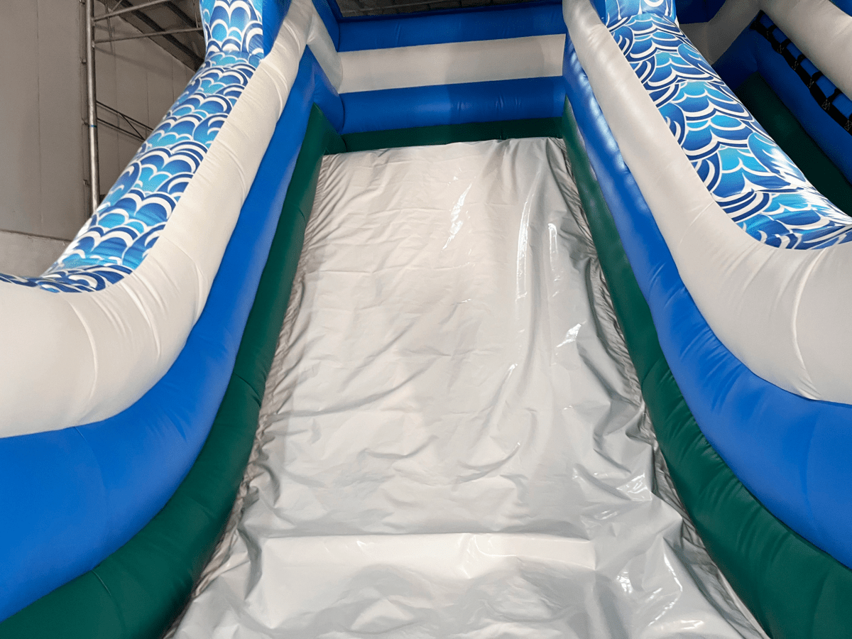 Горка и бассейн выполнены из армированного ПВХ высокой плотности (690–1100 г/м²) толщиной 0,55–0,9 мм. Этот материал устойчив к механическим повреждениям, ультрафиолету, перепадам температуры и влаге. Водная горка работает на постоянном поддуве, что гарантирует сохранение формы и устойчивость даже при интенсивной эксплуатации.