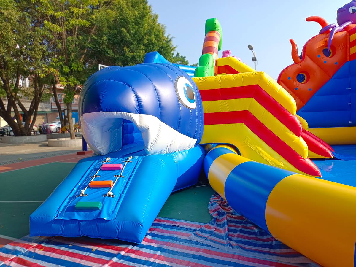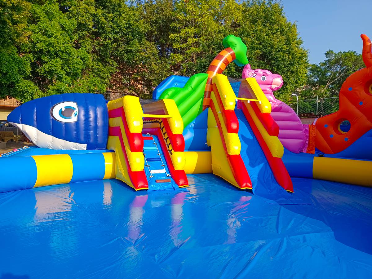 Габариты 20x17x7 м и общая площадь 340 м² позволяют разместить аттракцион как на открытых водных площадках, так и в крытых бассейнах торговых центров. Благодаря технологии постоянного поддува и использованию армированного ПВХ промышленного класса, комплекс сохраняет форму и устойчивость даже при активной эксплуатации в течение всего сезона.