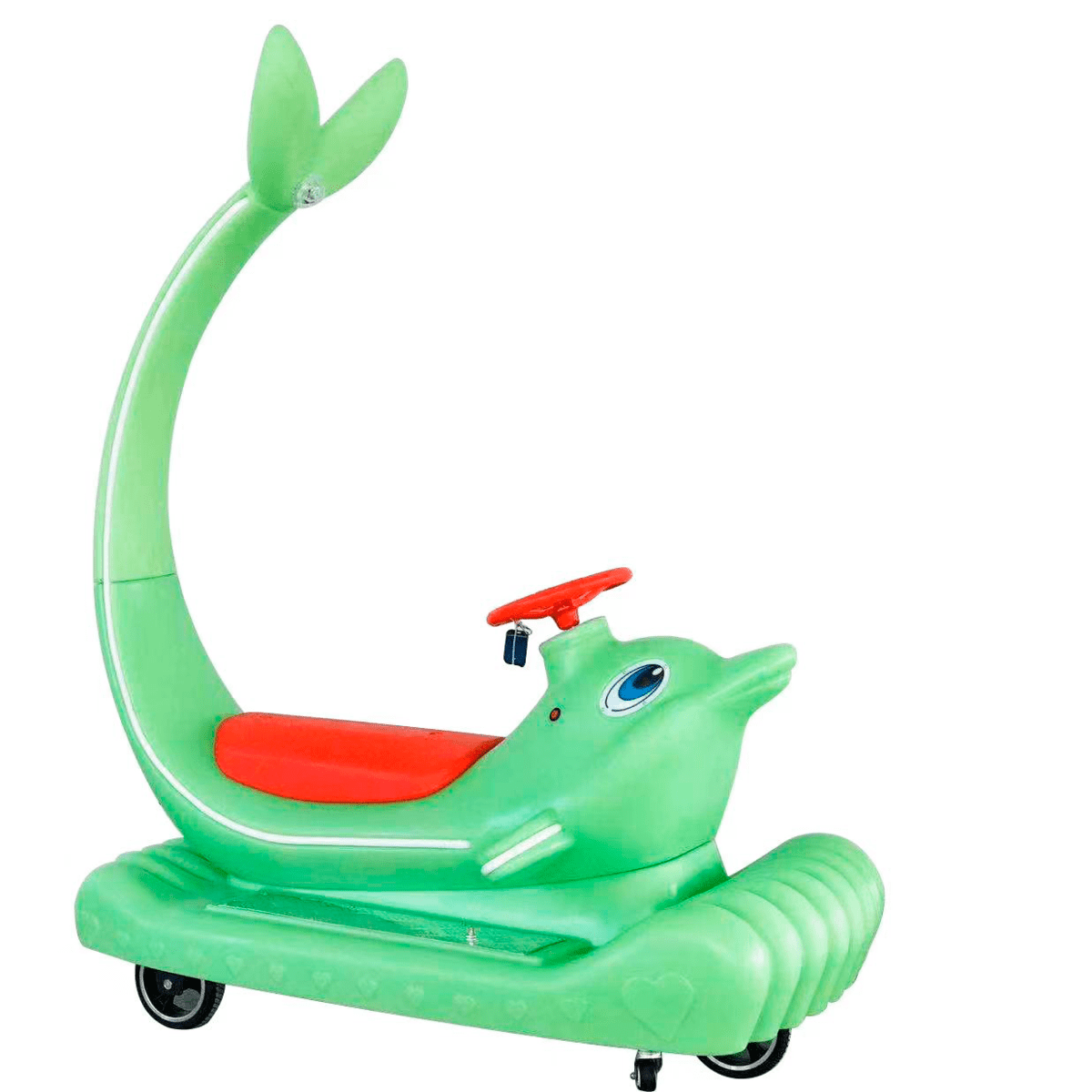 Зелёный «Дельфинчик-Морячок» выделяется своим сияющим цветом, напоминающим морскую волну. Его высокий хвост с подсветкой и добрые глаза создают ощущение дружелюбия и игры. А разноцветные огни по корпусу превращают поездку в настоящее световое шоу!