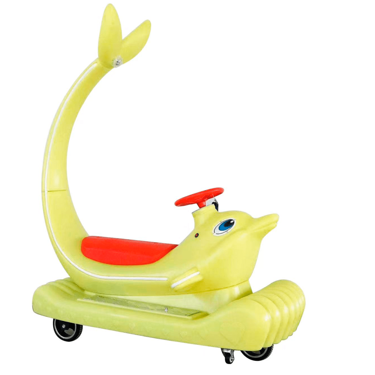 Жёлтый «Дельфинчик-Морячок» выделяется своим сияющим цветом, напоминающим морскую волну. Его высокий хвост с подсветкой и добрые глаза создают ощущение дружелюбия и игры. А разноцветные огни по корпусу превращают поездку в настоящее световое шоу!