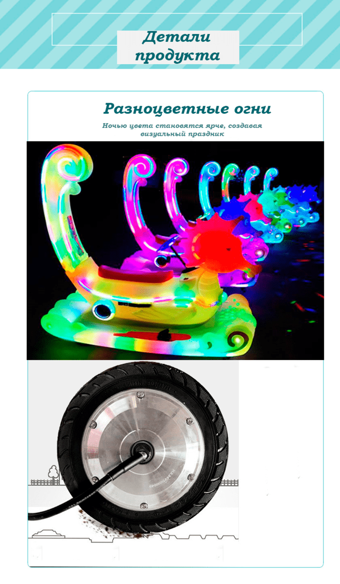 Разноцветная подсветка по периметру делает аттракцион особенно эффектным в вечернее время, превращая катание в сияющее шоу.