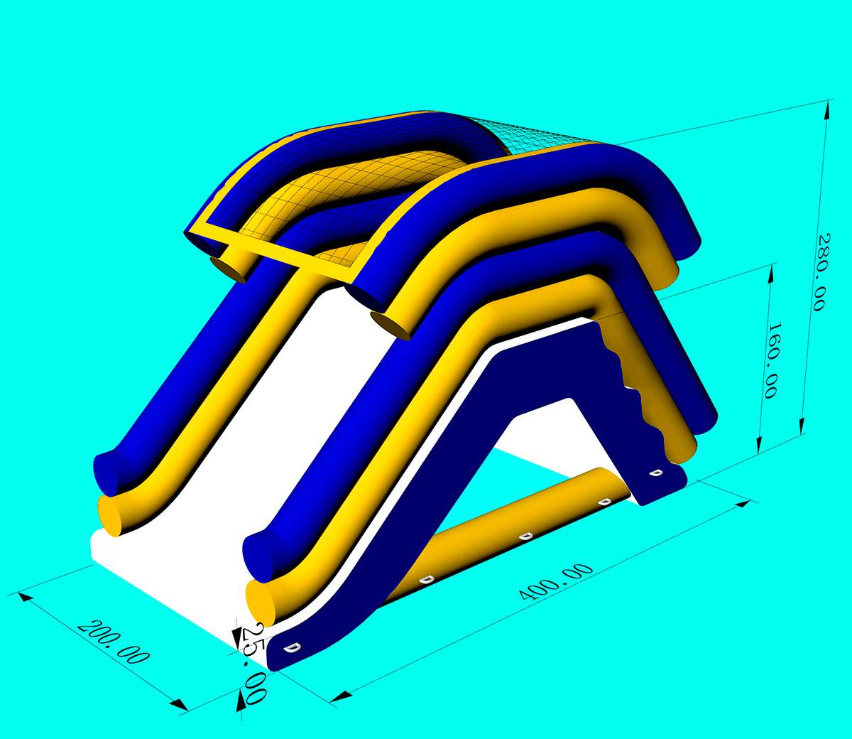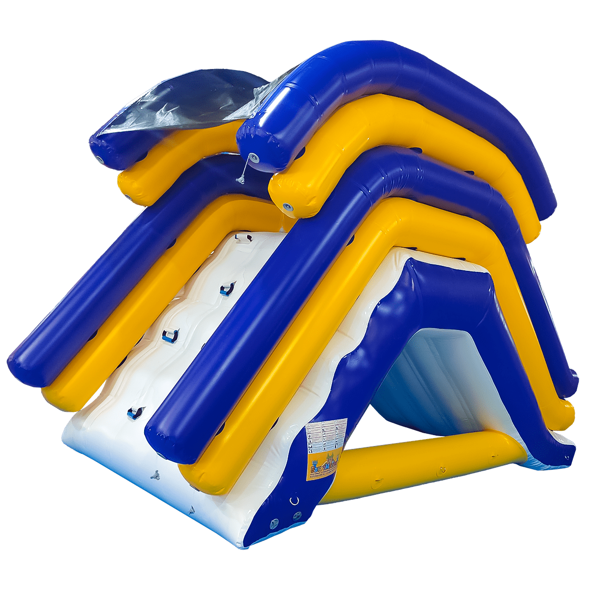 Геометрия горки спроектирована для комфортного и безопасного спуска. Начальная высота — 1,6 м, один широкий скат с защитными бортами задаёт траекторию, исключая выпадение за пределы игрового коридора. Подъём организован с помощью надувной лестницы, интегрированной в модуль шириной 2 м; хватовые петли и рельефные элементы облегчают подъём детям и подросткам. Формат 4 м в длину и 3,2 м по вершине обеспечивает динамичный спуск и мягкое торможение на финише. Базовая версия рассчитана на два одновременных пользователя; оператору легко поддерживать ритм очереди и соблюдать интервалы старта. Цветовая гамма — классическая синие, жёлтые и белые сегменты — хорошо заметна на воде и на берегу, а контрастные дуги служат визуальными ориентирами для посетителей.