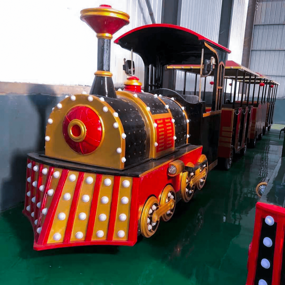 Безрельсовый поезд выполнен в ретро-стиле, напоминающем классический паровоз. Основные цвета – красный, черный и золотистый, с декоративными элементами и подсветкой.