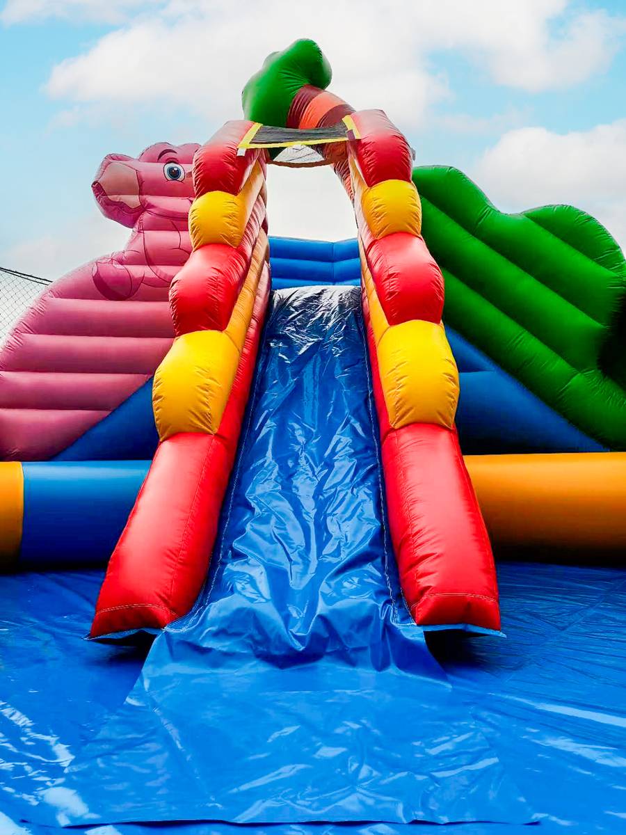 Конструкция представляет собой комплекс из трёх красочных горок с плавным спуском в большой круглый бассейн объёмом около 157 кубических метров воды. Основной материал — усиленный армированный ПВХ толщиной до 0,9 мм, устойчивый к ультрафиолету, влаге и механическим нагрузкам.