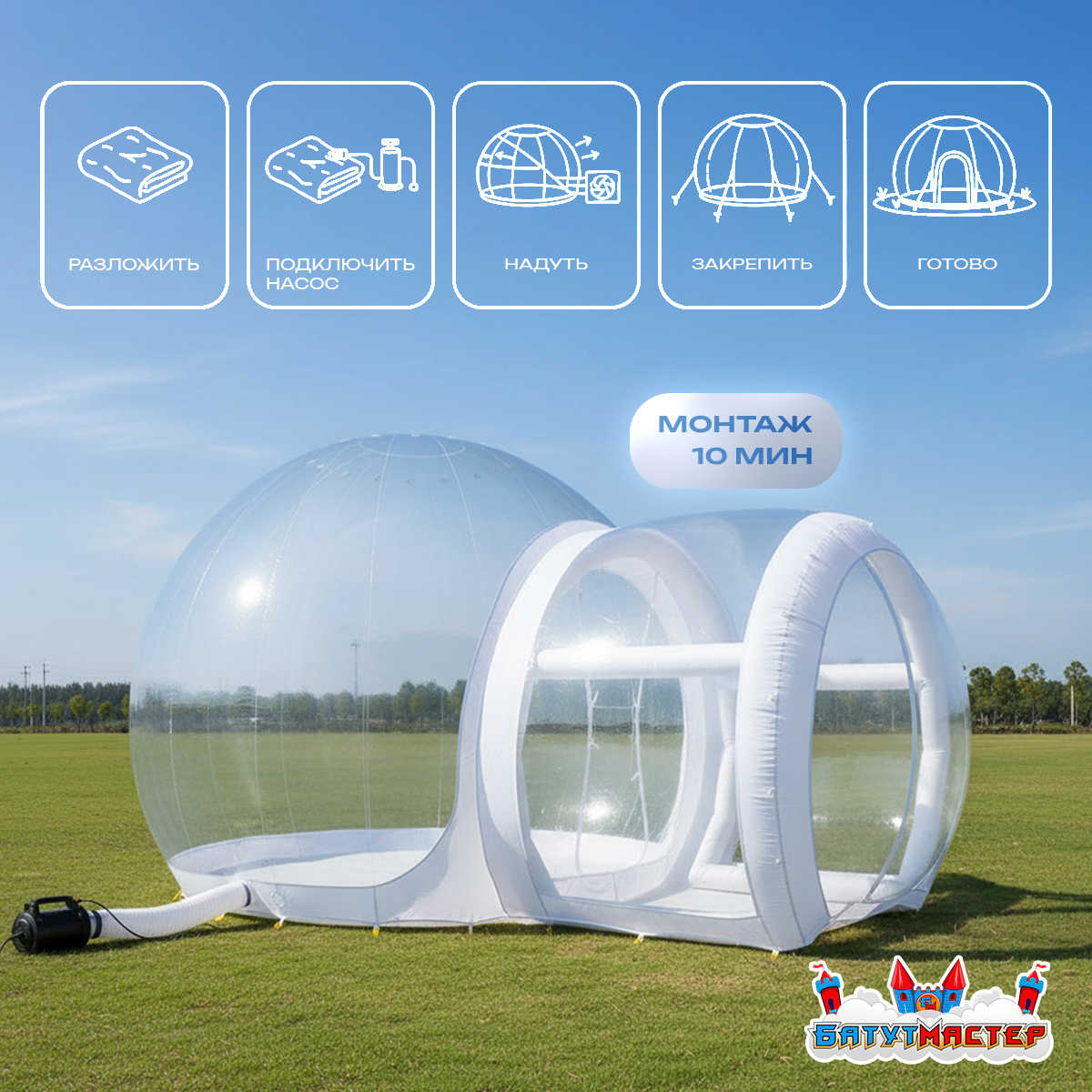 Установка занимает не более 10 минут — достаточно разложить палатку, подключить насос (идёт в комплекте), надуть и закрепить. Всё просто, быстро и удобно.