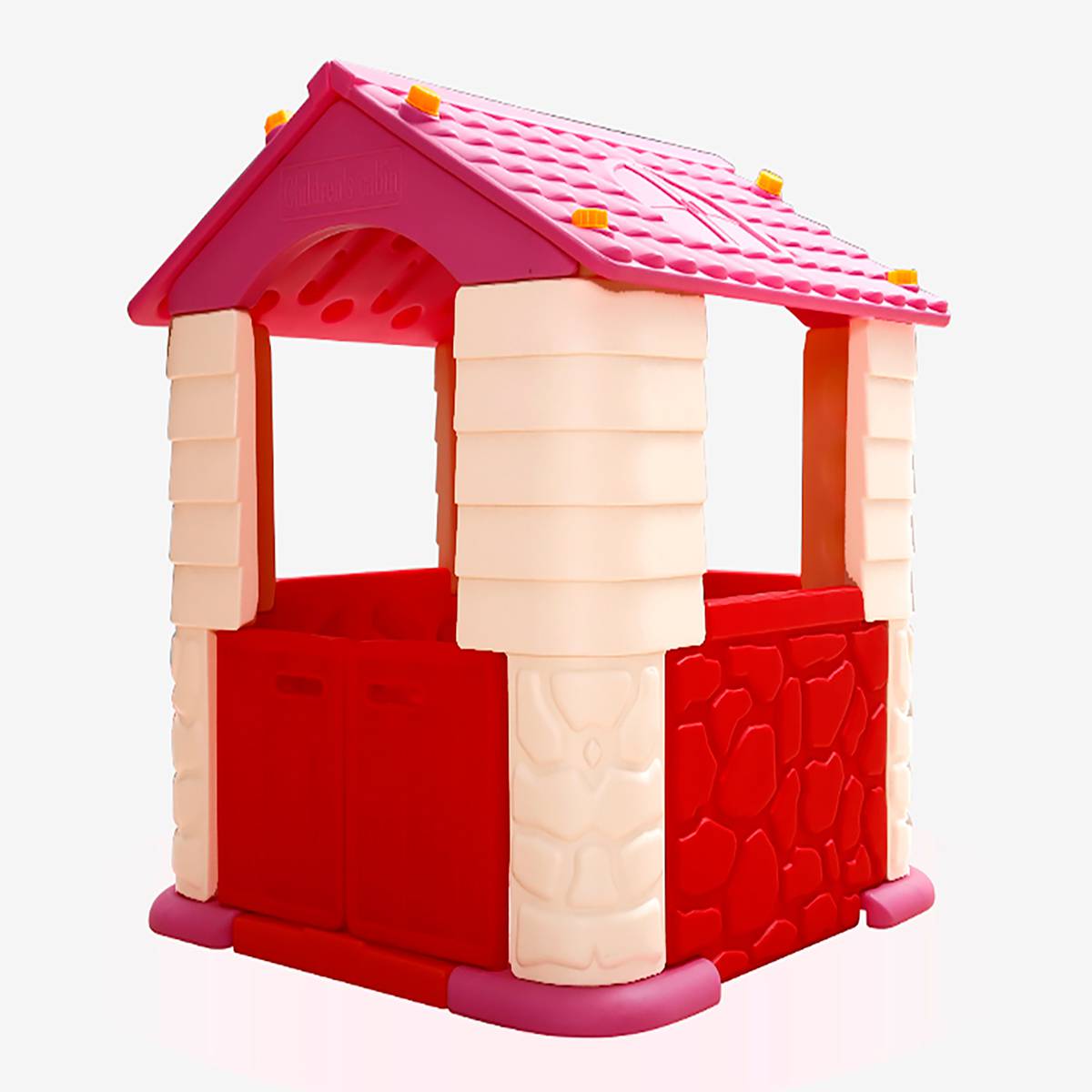 Яркое сочетание розового, красного и бежевого цветов создаёт атмосферу сказки и нежности. Домик оформлен в виде миниатюрного коттеджа с открытыми проёмами, декоративными стенами и ажурной крышей, что способствует естественному освещению и комфорту внутри.