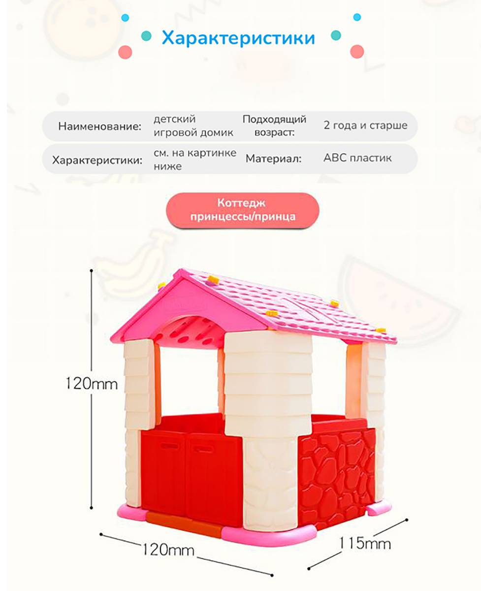 «Коттедж принцессы» сочетает яркий дизайн и продуманную конструкцию. Его цветовая гамма способствует созданию атмосферы веселья и тепла. Конструкция устойчива, надёжна и адаптирована для эксплуатации в помещениях и на открытых площадках. Игровой домик не требует специальных условий установки — его можно разместить на любой ровной поверхности. Благодаря простоте сборки и лёгкому обслуживанию, он удобен для постоянного или временного использования, например, во время фестивалей и выездных мероприятий.