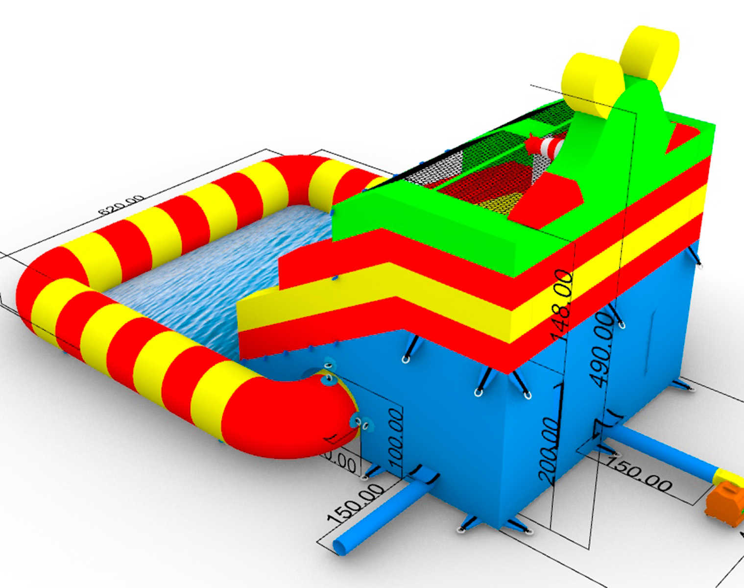 Горка начинается с высоты в 2 метра от земли и ведёт вниз к мягкому, герметичному бассейну глубиной 0,9 м и размерами 5,9 на 6,2 м. Такой размер позволяет детям безопасно скатываться и наслаждаться мягким приземлением в воду.