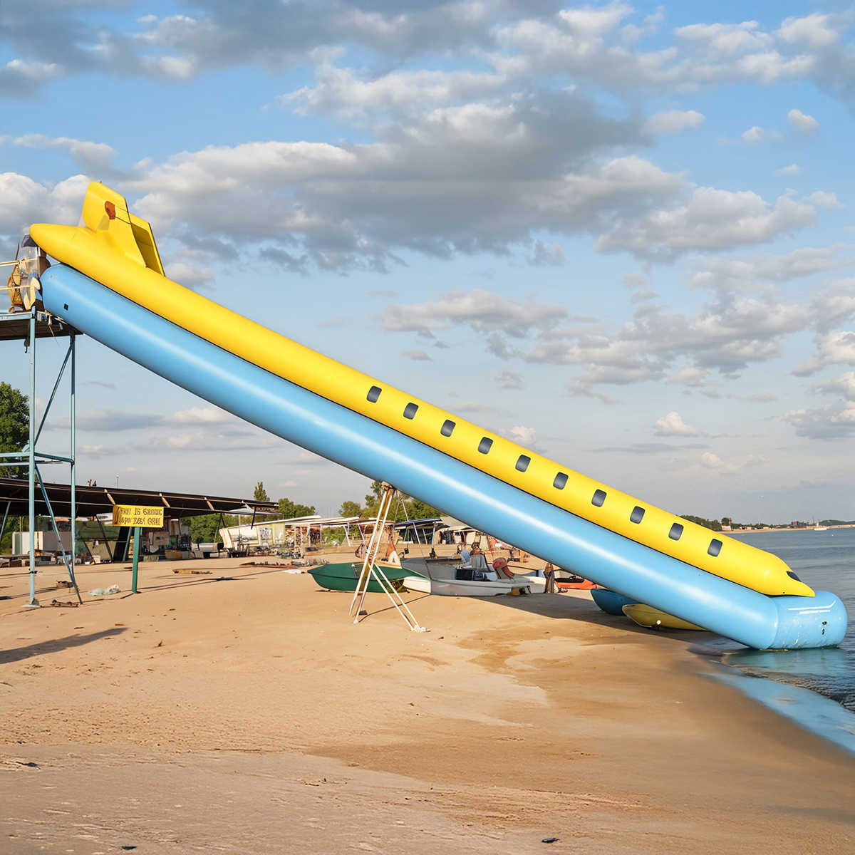 Дизайн горки выполнен в ярких желто-голубых цветах, что делает её заметной и привлекательной для посетителей. Герметичная конструкция и использование качественных материалов обеспечивают надежность даже при интенсивной эксплуатации. Эта горка идеально подходит для установки в таких местах, как пляжи, водные парки, базы отдыха, яхт-клубы или частные мероприятия.