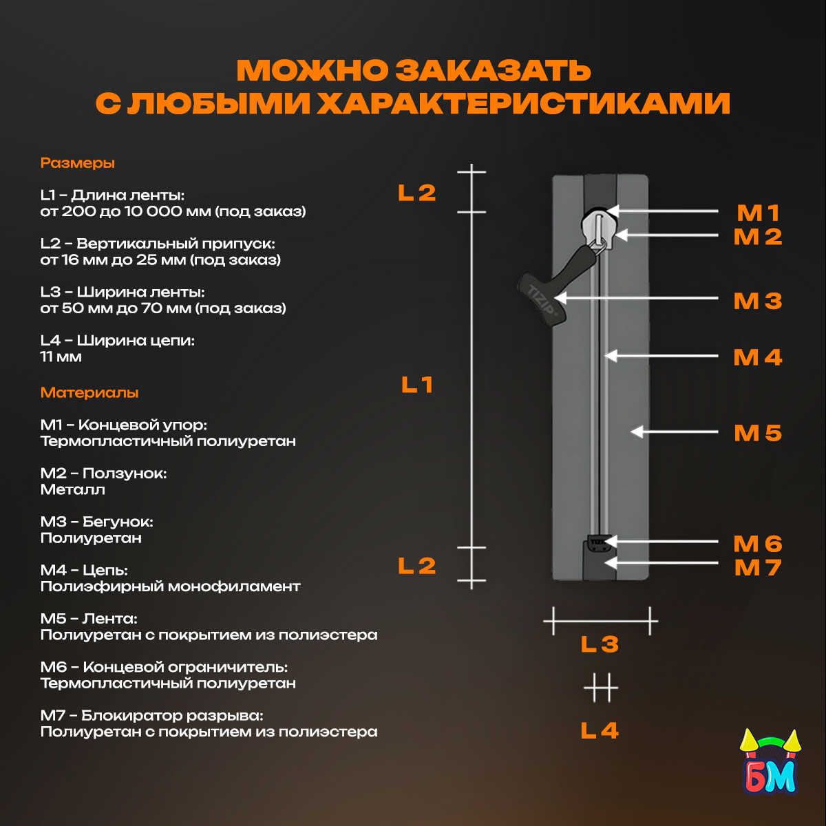ПРИ ЗАКАЗЕ МОЛНИИ ПО СВОИМ (НЕ СТАНДАРТНЫМ) РАЗМЕРАМ: УТОЧНЯЙТЕ МИНИМАЛЬНУЮ ПАРТИЮ У МЕНЕДЖЕРОВ, МИНИМАЛЬНЫЙ СРОК ПОСТАВКИ - 70 ДНЕЙ.