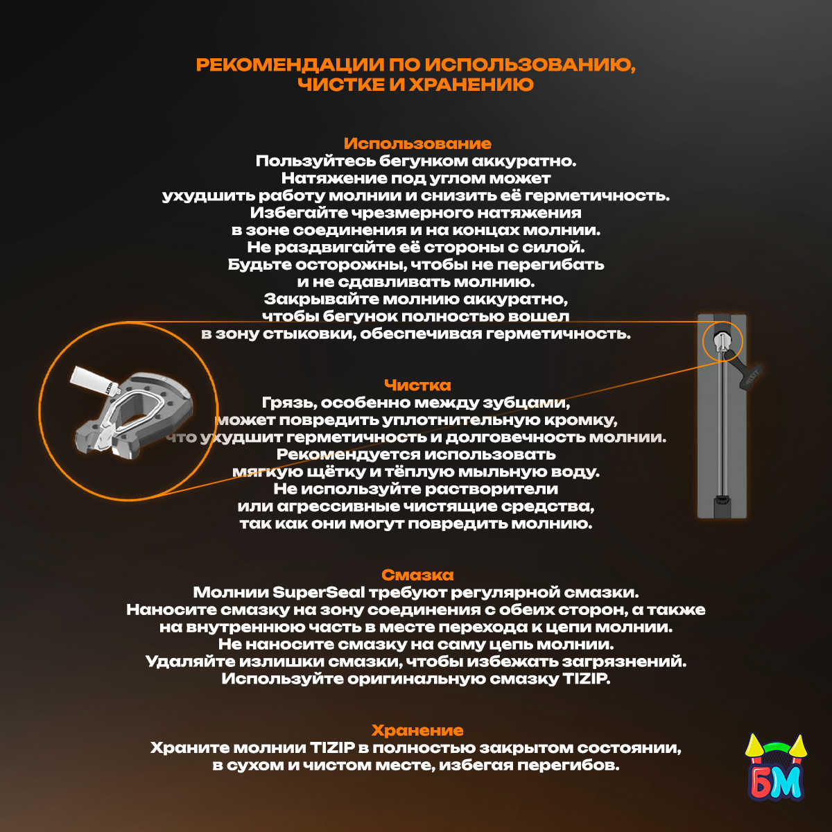 Во время эксплуатации. Запрет на резкие действия: Не допускайте резкого открывания или закрывания молнии, чтобы избежать повреждений. Контроль герметичности: Регулярно проверяйте молнию на наличие утечек воздуха или воды. Не допускайте попадания песка, грязи или мелких частиц на зубцы молнии. -
