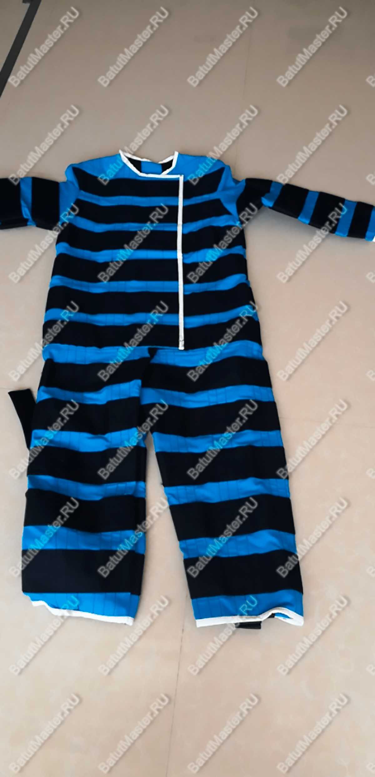 Костюм выполнен в синем цвете с черными широкими липучими полосами по всей длине.