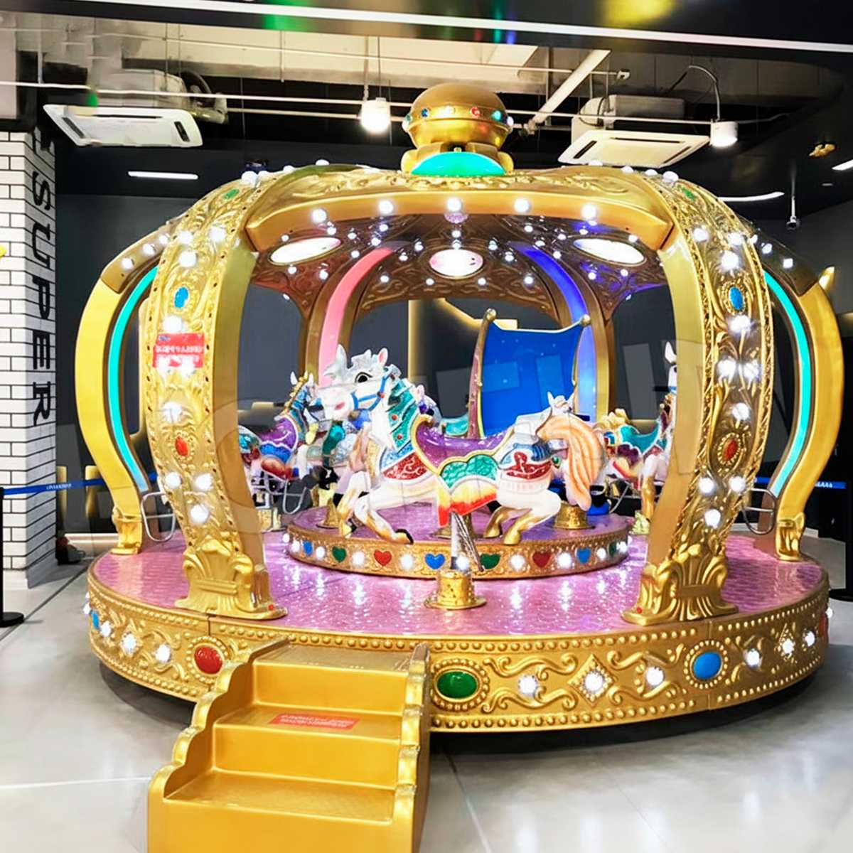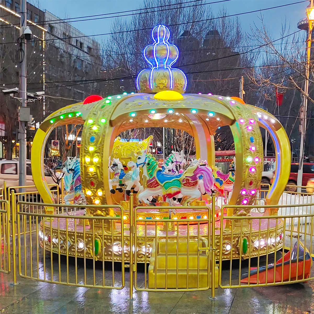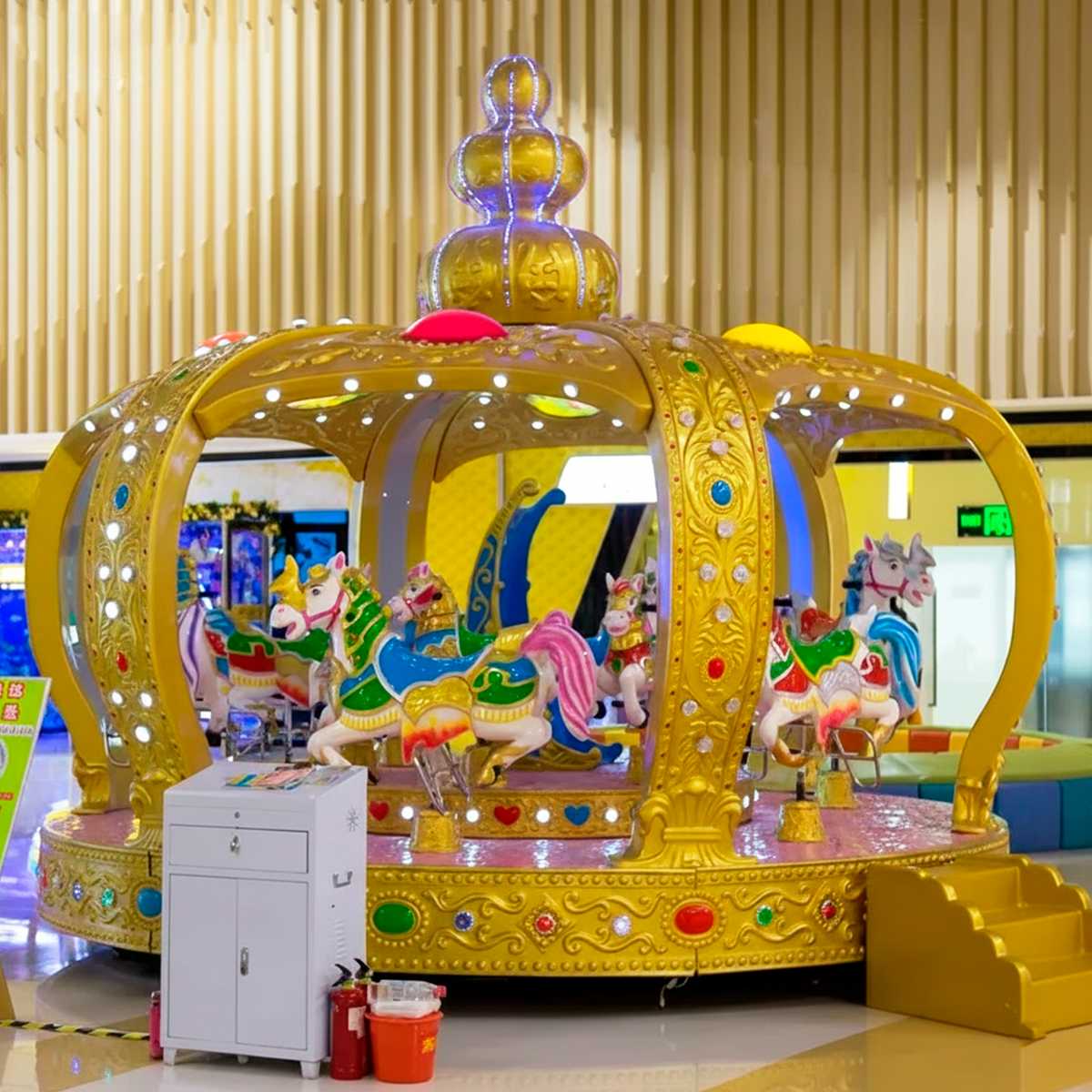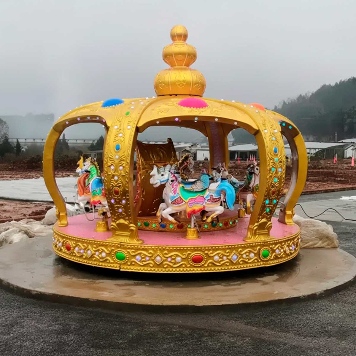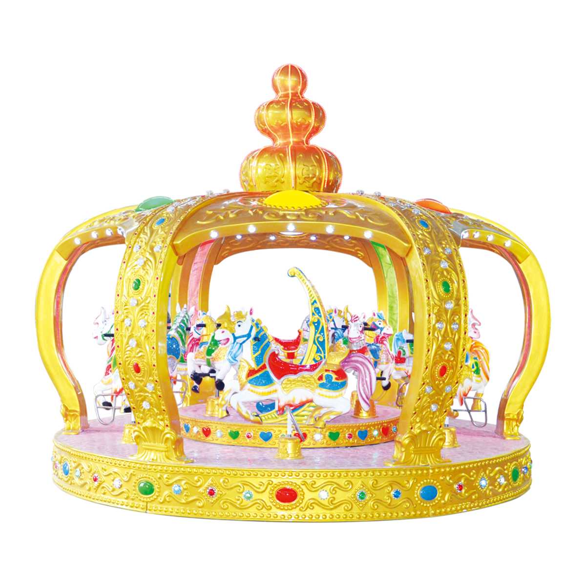 Детская карусель «Золотая корона» — это настоящий символ роскоши и сказки. Её великолепный дизайн в форме сверкающей золотой короны с объемным декором и яркими цветными вставками создаёт торжественную атмосферу. Оформление карусели выполнено в теплых золотистых и белых тонах, украшено стилизованными драгоценными камнями, что придаёт аттракциону эффект королевской реликвии.