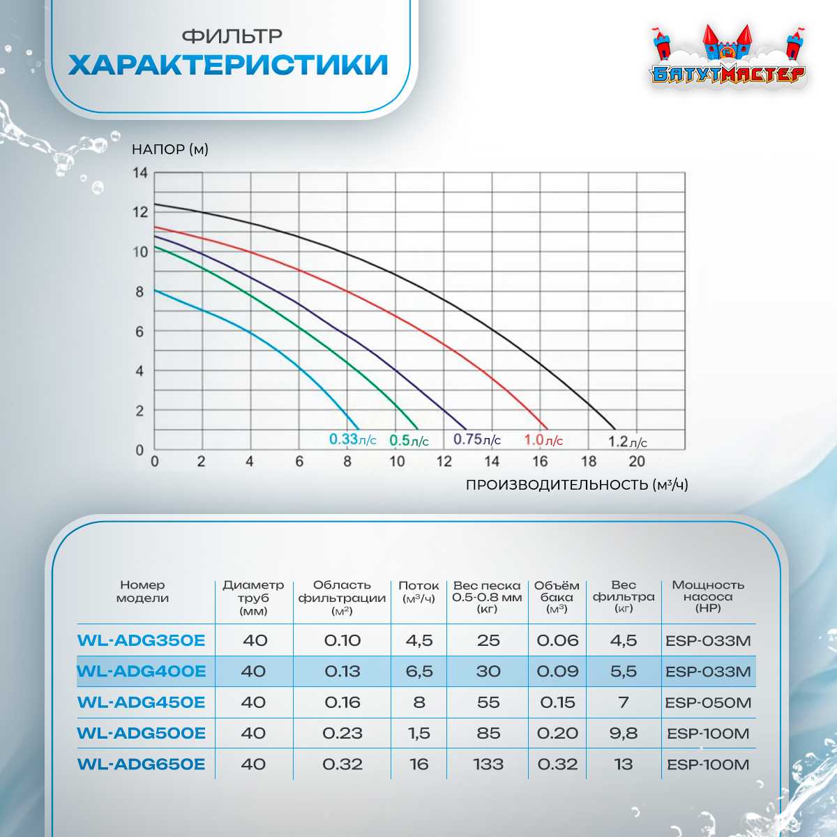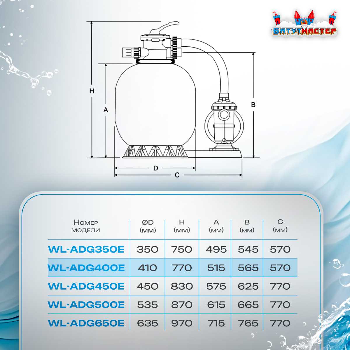 Песочный фильтр WL-ADG400E с надежным циркуляционным насосом ESP0.33HP - оптимальное решение для средних домашних и коммерческих бассейнов объемом до 52 м³. Увеличенный диаметр фильтра обеспечивает большую площадь фильтрации при той же мощности насоса, что гарантирует более качественную очистку воды.