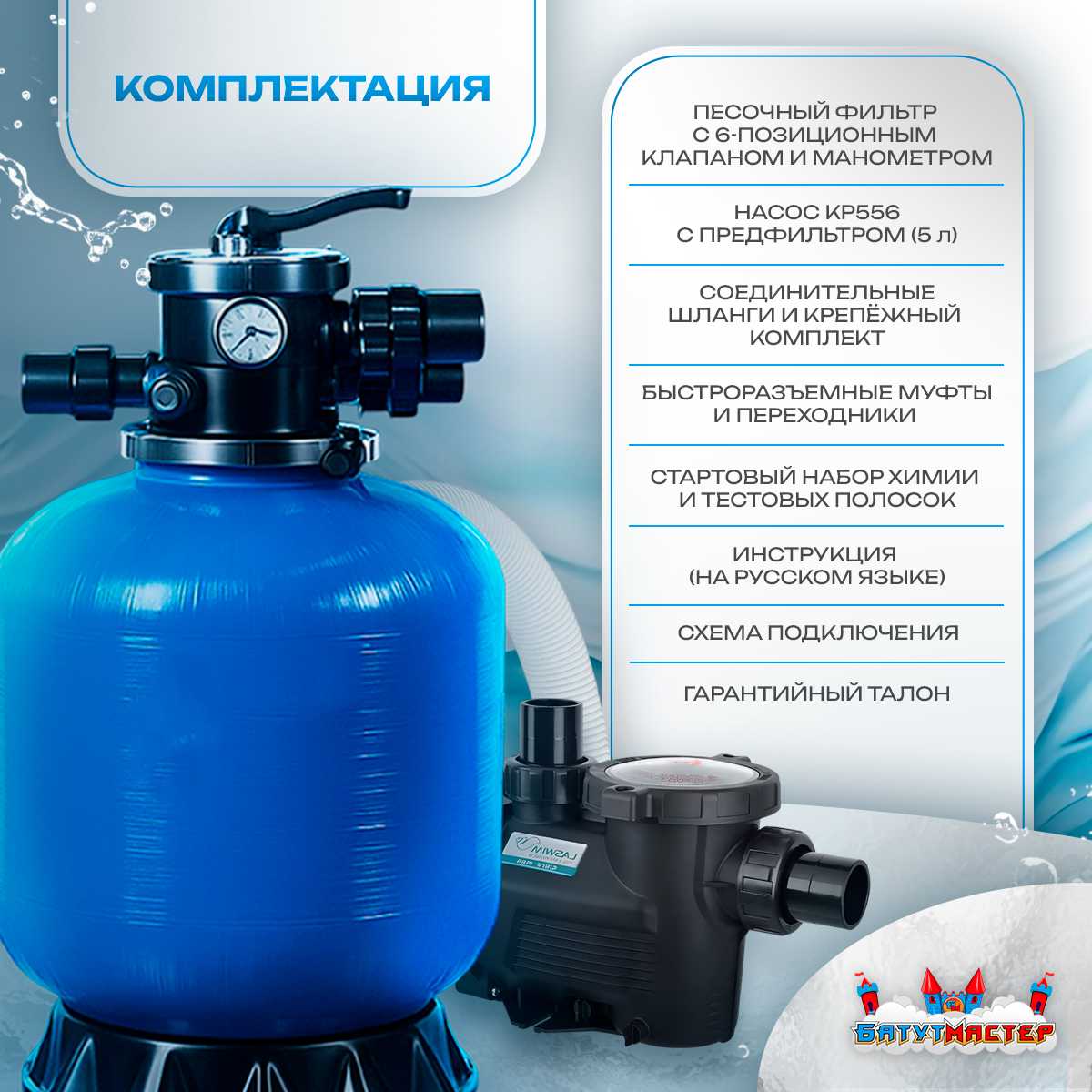 Песочный фильтр WL-ADG450E с усиленным циркуляционным насосом KP556 - это профессиональное решение для крупных домашних бассейнов объемом до 64 м³. Система сочетает большую площадь фильтрации с более мощным насосом серии KP, обеспечивая высокое качество очистки при сохранении экономичности эксплуатации.