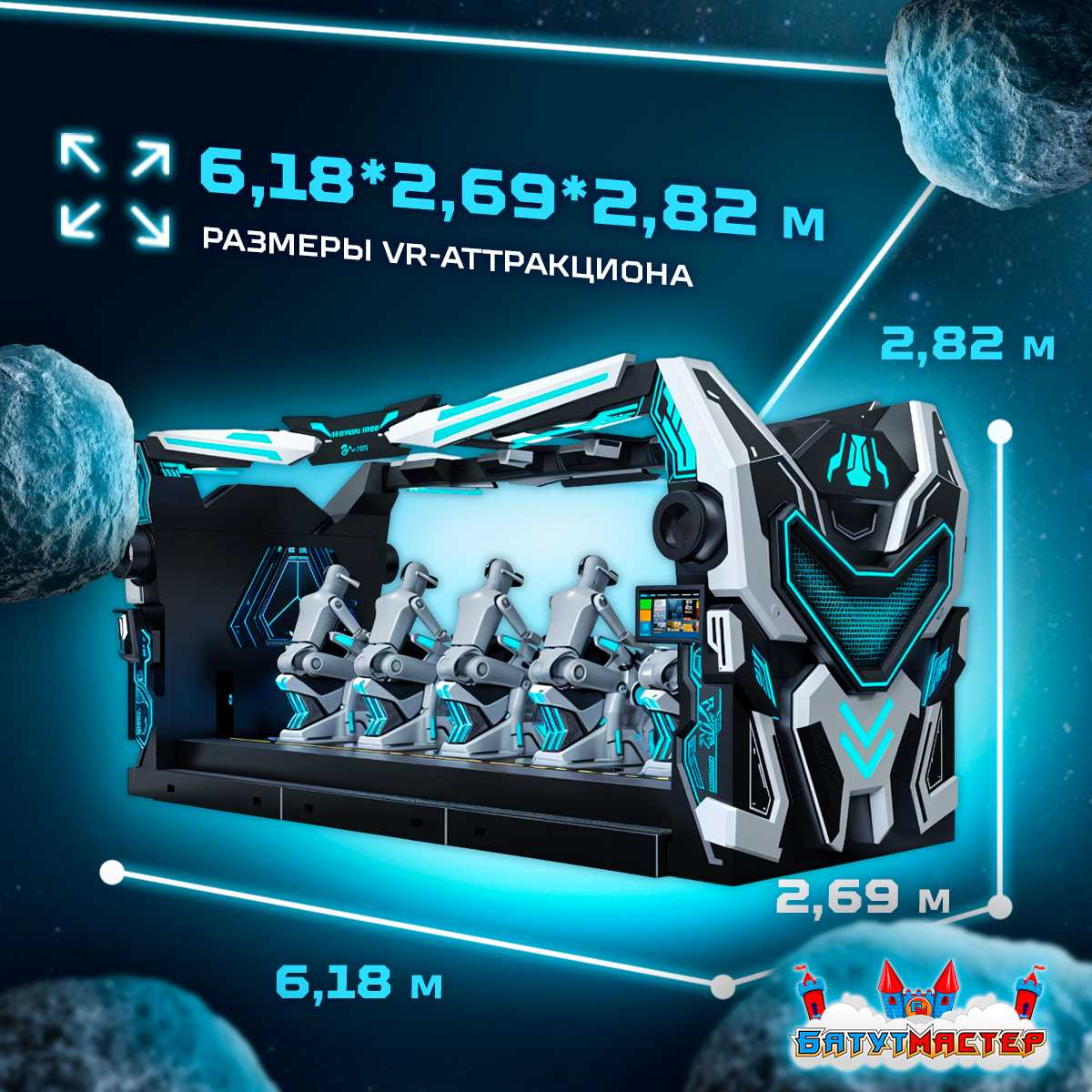 Каждый пользователь получает индивидуальный VR-шлем DPVR E4, который обеспечивает яркую и чёткую картинку с высокой частотой кадров. Игроки садятся в кресла, выполненные в стиле футуристических мотоциклов или боевых костюмов. Все кресла синхронизированы и реагируют на происходящее в виртуальной реальности: