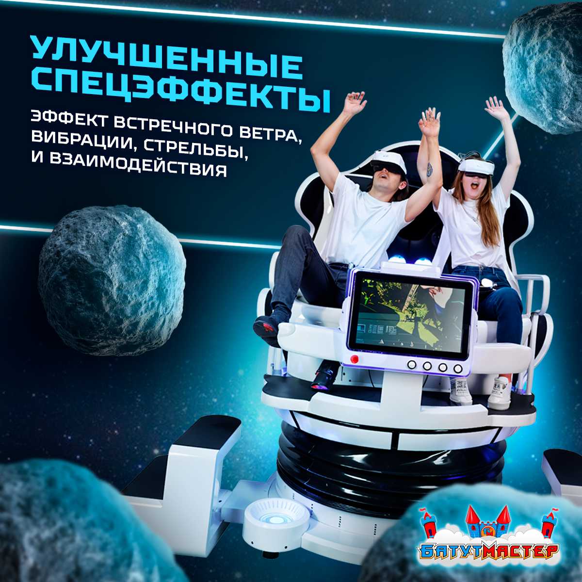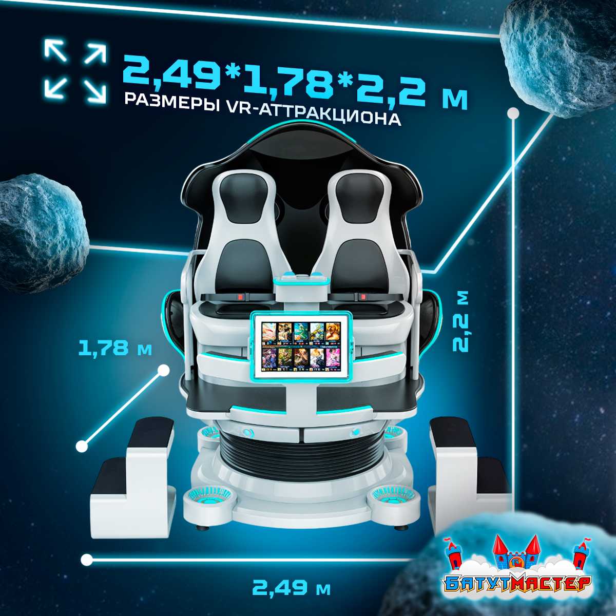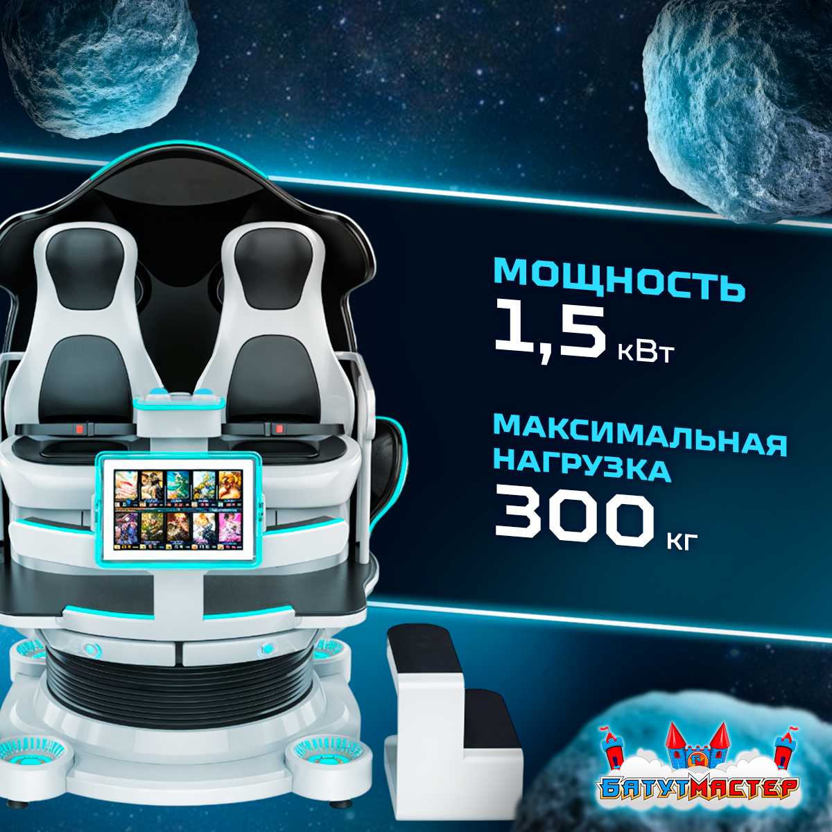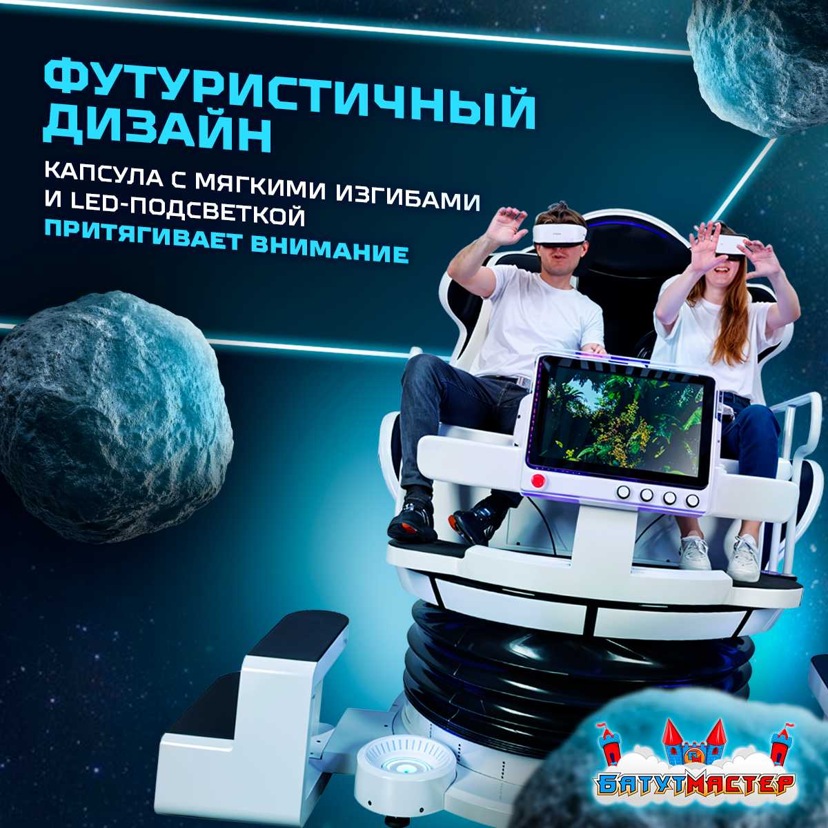 Аттракцион выглядит как кабина межзвёздного шаттла — стильный, бело-серый корпус, округлые формы, неоновая подсветка. Он сразу выделяется и привлекает внимание, превращаясь в визуальный якорь для прохожих и посетителей. Кресла в аттракционе мягкие, прочные и рассчитан до 300 кг, а азначит подойдёт для любых игроков любого возраста. Безопасность обеспечивают прочные ремни, а продуманная форма даёт возможность комфортно переживать даже активные сцены полёта и манёвров.