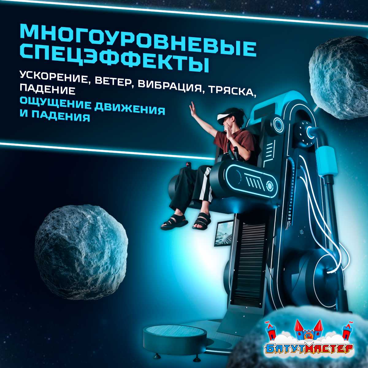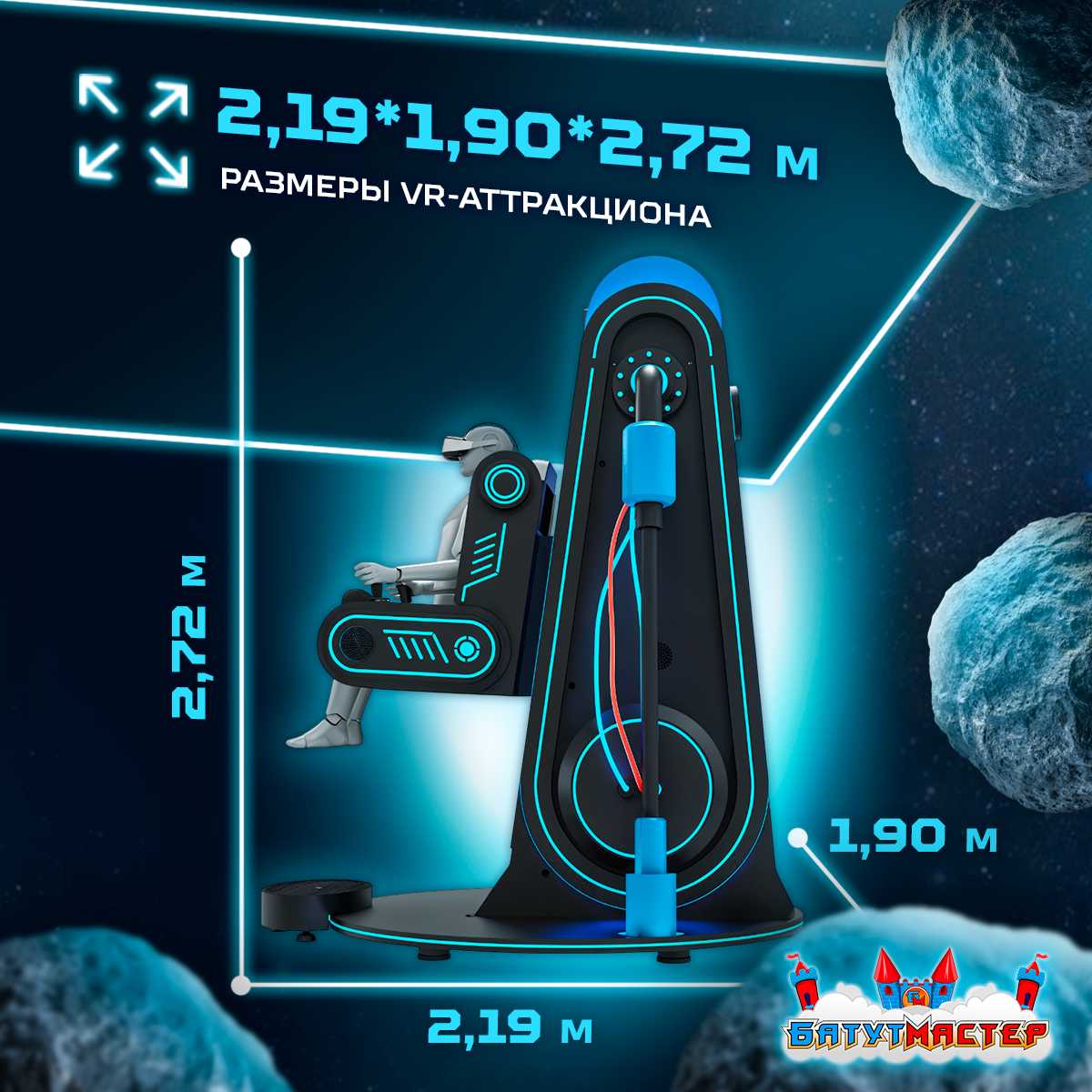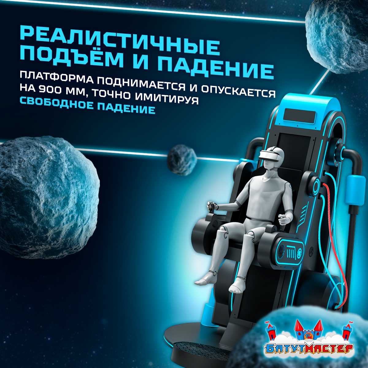 Визуальный стиль аттракциона стилизован под футуристическую космическую станцию. Неоновая подсветка, эргономичное кресло, надёжные ремни безопасности и устойчивое основание делают его не только привлекательным, но и безопасным.