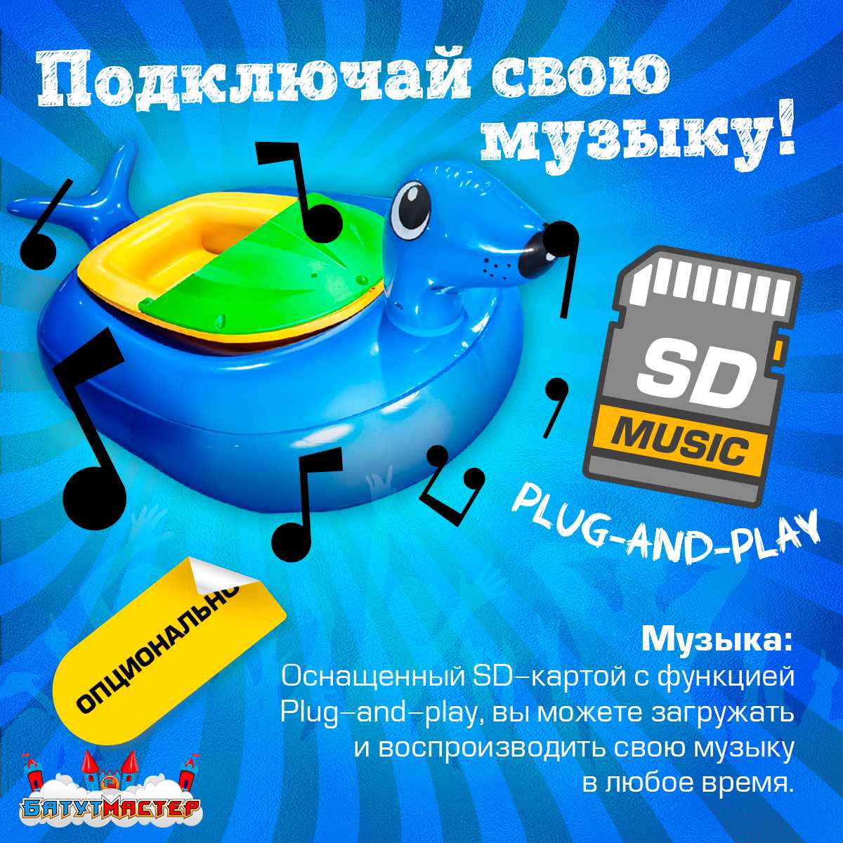 Дополнительно лодка оснащена музыкальным модулем с SD-картой, позволяющим воспроизводить музыку во время катания. Это создаёт праздничную атмосферу и делает аттракцион ещё более привлекательным для детей.